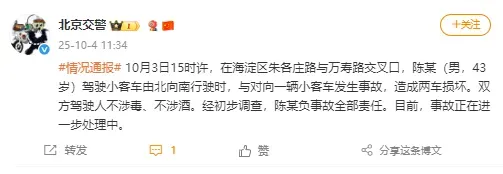 随后,陈震转发北京交警情况通报,并发文称:“一切以官方通告,车辆EDR数据为准。”
