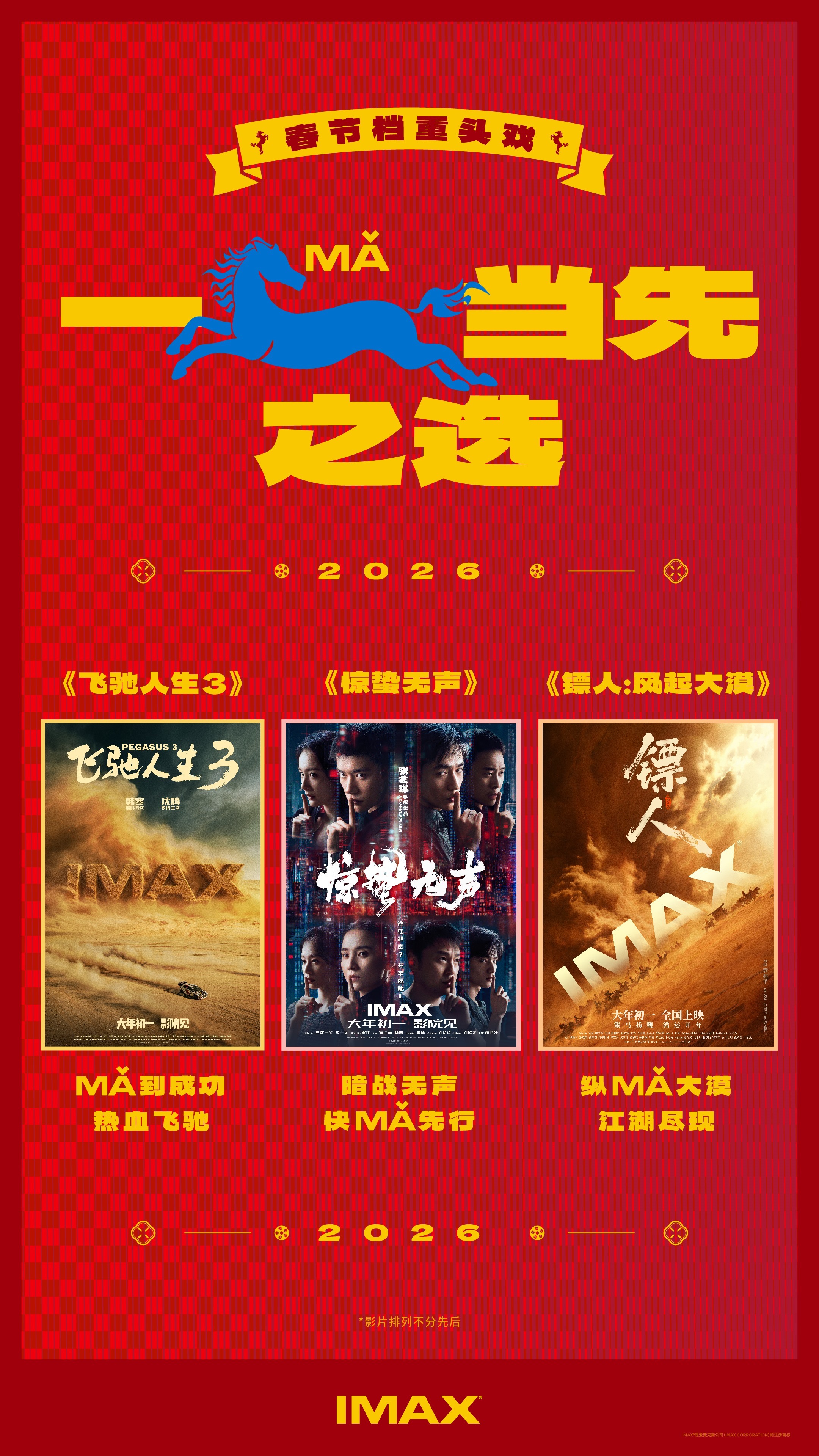 2026年2月6日,IMAX中国控股有限公司宣布,2026丙午马年春节,《飞驰人生3》《镖人:风起大漠》《惊蛰无声》三部华语电影将登陆IMAX影院。此次汇聚人气IP的热血回归、暌违已久的多代武侠人爽燃动作集结及首部聚焦当代国家安全题材的突破尝试,多元化类型与IMAX招牌沉浸式体验结合,将满足不同观众的观影期待,为新春团圆时刻增添一份光影温度与共同记忆。(影片介绍按照定档顺序排序)