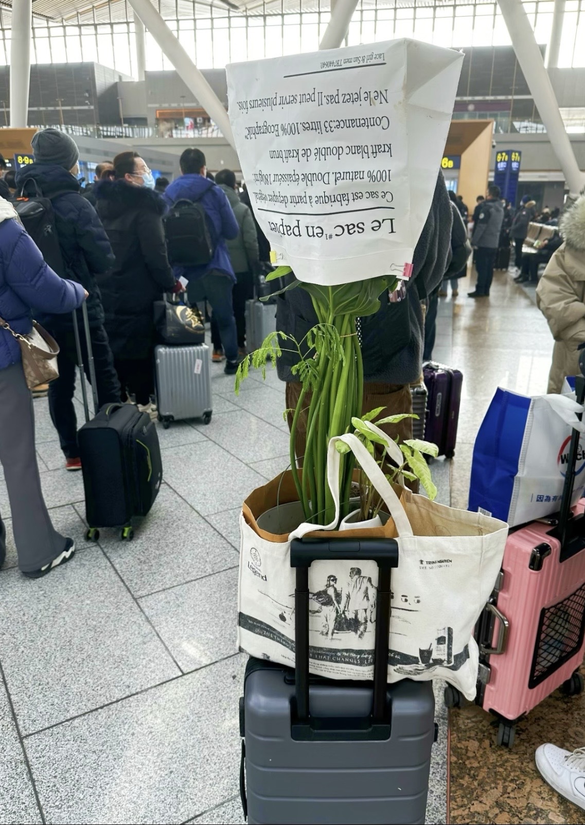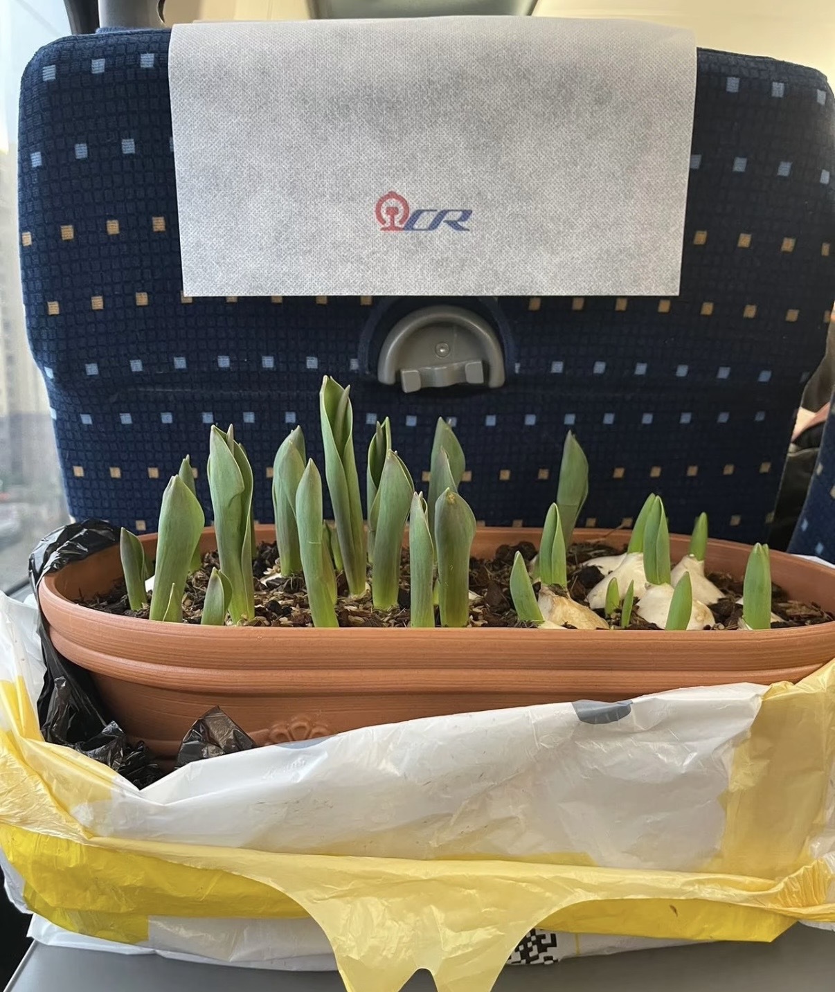 网友@七喜和桃子 将一盆郁金香带上了从南往北的高铁。