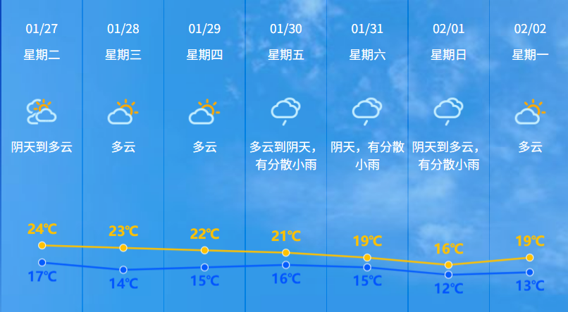 预计今日中山市阴天到多云,早晚有轻雾,28-29日受弱冷空气影响,早晨最低气温略有下降。展望30日-2月1日,受冷空气影响,云量增多,有分散小雨,气温下降。