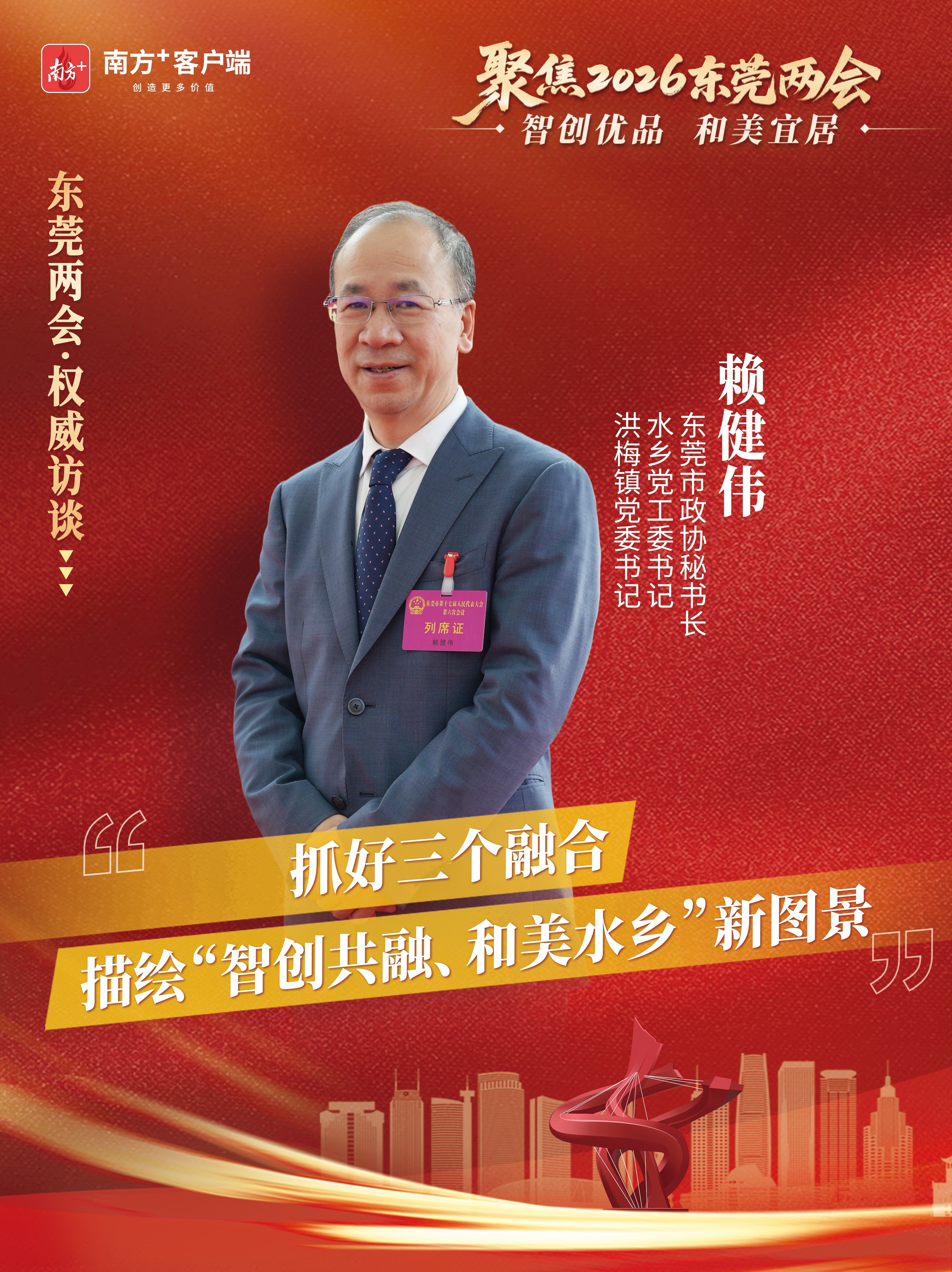 东莞两会期间,东莞市政协秘书长、水乡经济区党工委书记、洪梅镇党委书记赖健伟接受南方日报、南方+记者专访时表示,2026年水乡经济区将坚持产业升级与科创赋能相融合、扩大内需与民生提质相融合、湾区引领与动力激活相融合,描绘“智创共融、和美水乡”的新图景。