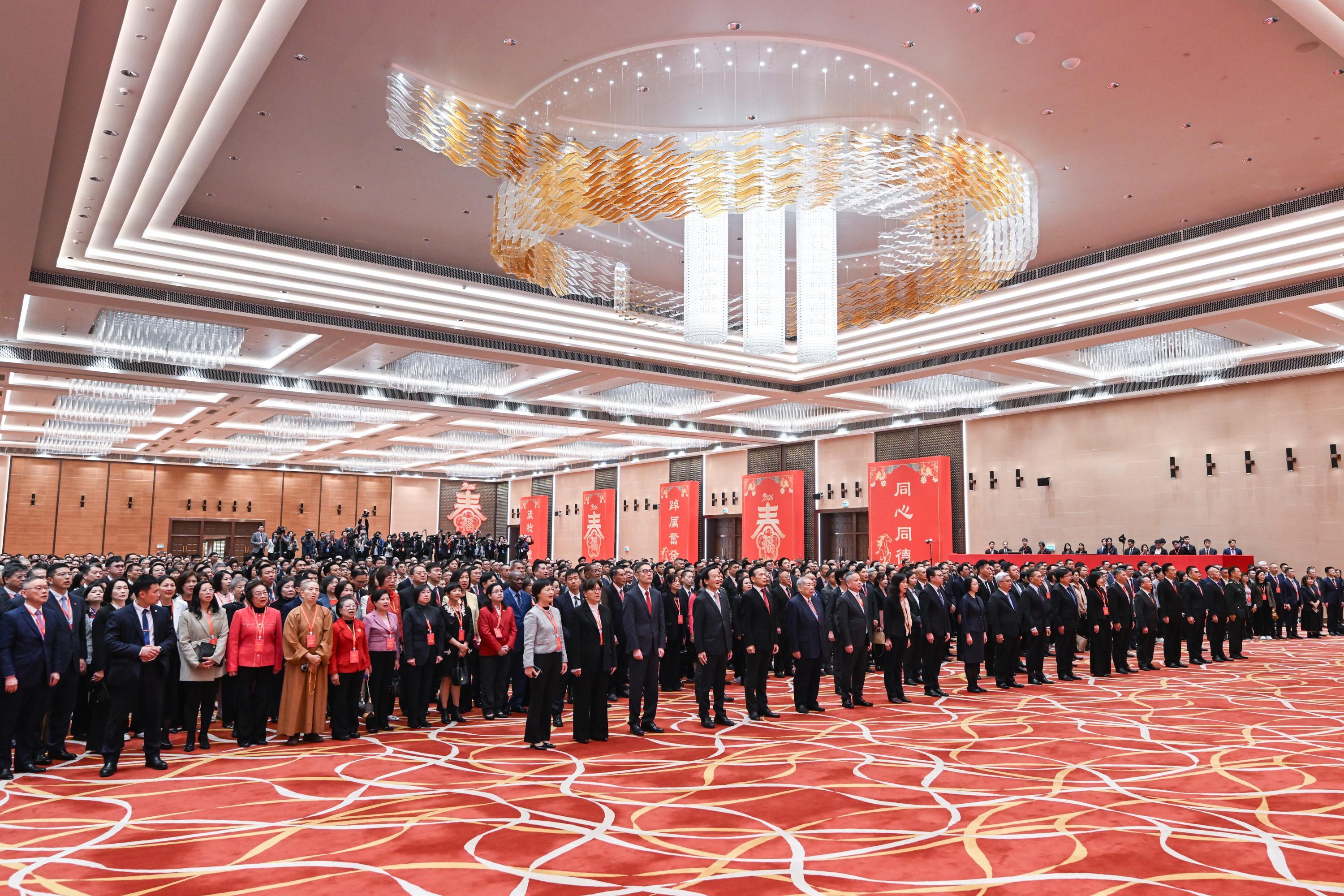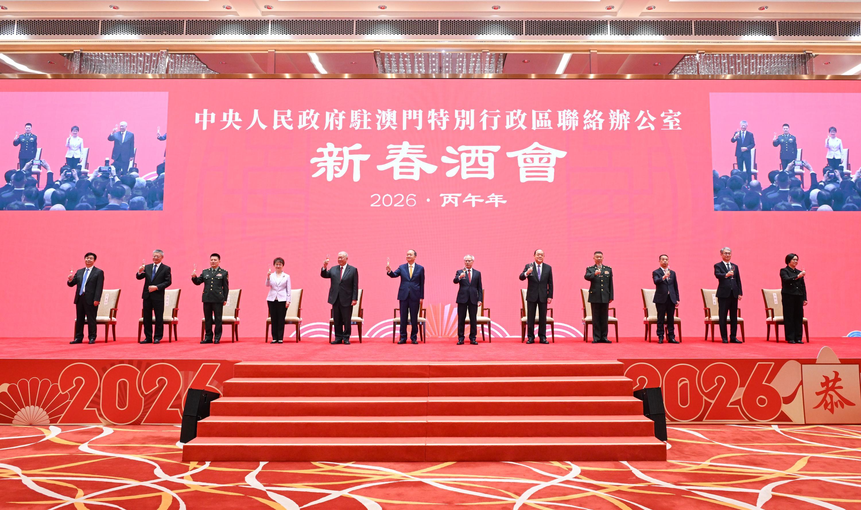 中央人民政府驻澳门特别行政区联络办公室2026年新春酒会现场。全国政协副主席何厚铧,中共中央港澳工作办公室副主任、国务院港澳事务办公室副主任、中央人民政府驻澳门特别行政区联络办公室主任郑新聪,前任澳门特区行政长官贺一诚,外交部驻澳门特派员公署特派员卞立新,解放军驻澳部队司令员于长江、政治委员林庆华,澳门中联办副主任黄柳权、吕玉印、张应杰,澳门立法会主席张永春,澳门终审法院院长宋敏莉以及澳门特区政府主要官员、澳区全国人大代表、澳区全国政协委员、行政会委员、立法会议员及社会各界代表人士等约1300名嘉宾出席了新春酒会。
