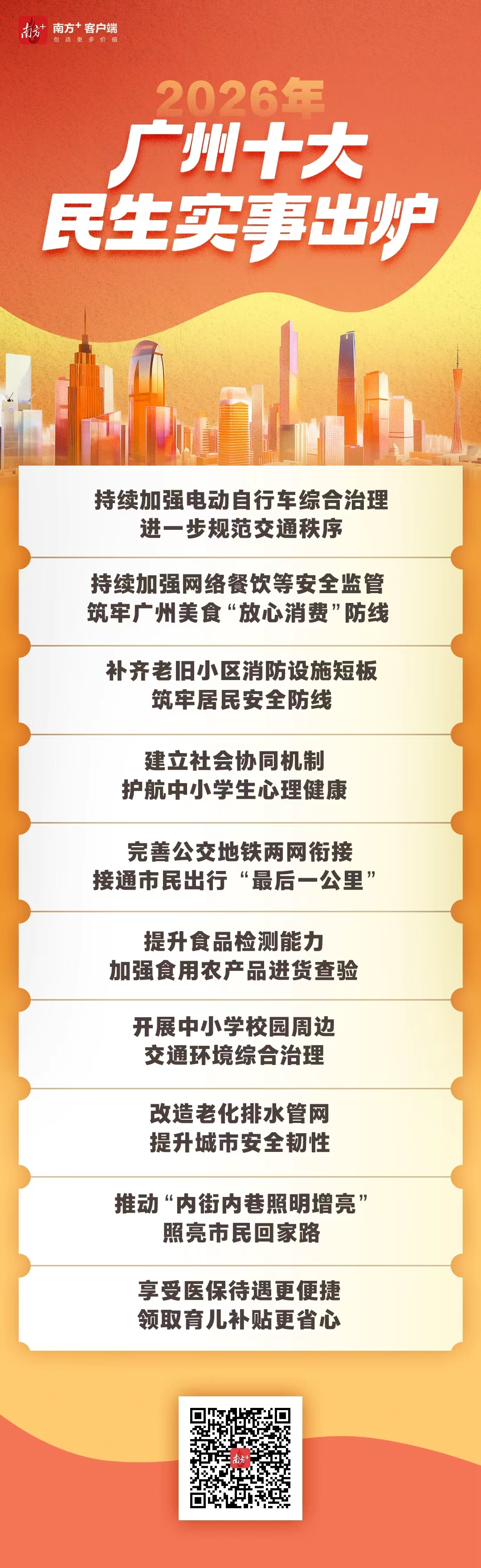 2026年广州民生实事出炉,你最期待哪个?(可多选) 持续加强电动自行车综合治理,进一步规范交通秩序 持续加强网络餐饮等安全监管,筑牢广州美食“放心消费”防线 补齐老旧小区消防设施短板,筑牢居民安全防线 建立社会协同机制,护航中小学生心理健康 完善公交地铁两网衔接,接通市民出行“最后一公里” 提升食品检测能力,加强食用农产品进货查验 开展中小学校园周边交通环境综合治理 改造老化排水管网,提升城市安全韧性 推动“内街内巷照明增亮”,照亮市民回家路 享受医保待遇更便捷,领取育儿补贴更省心 提交
