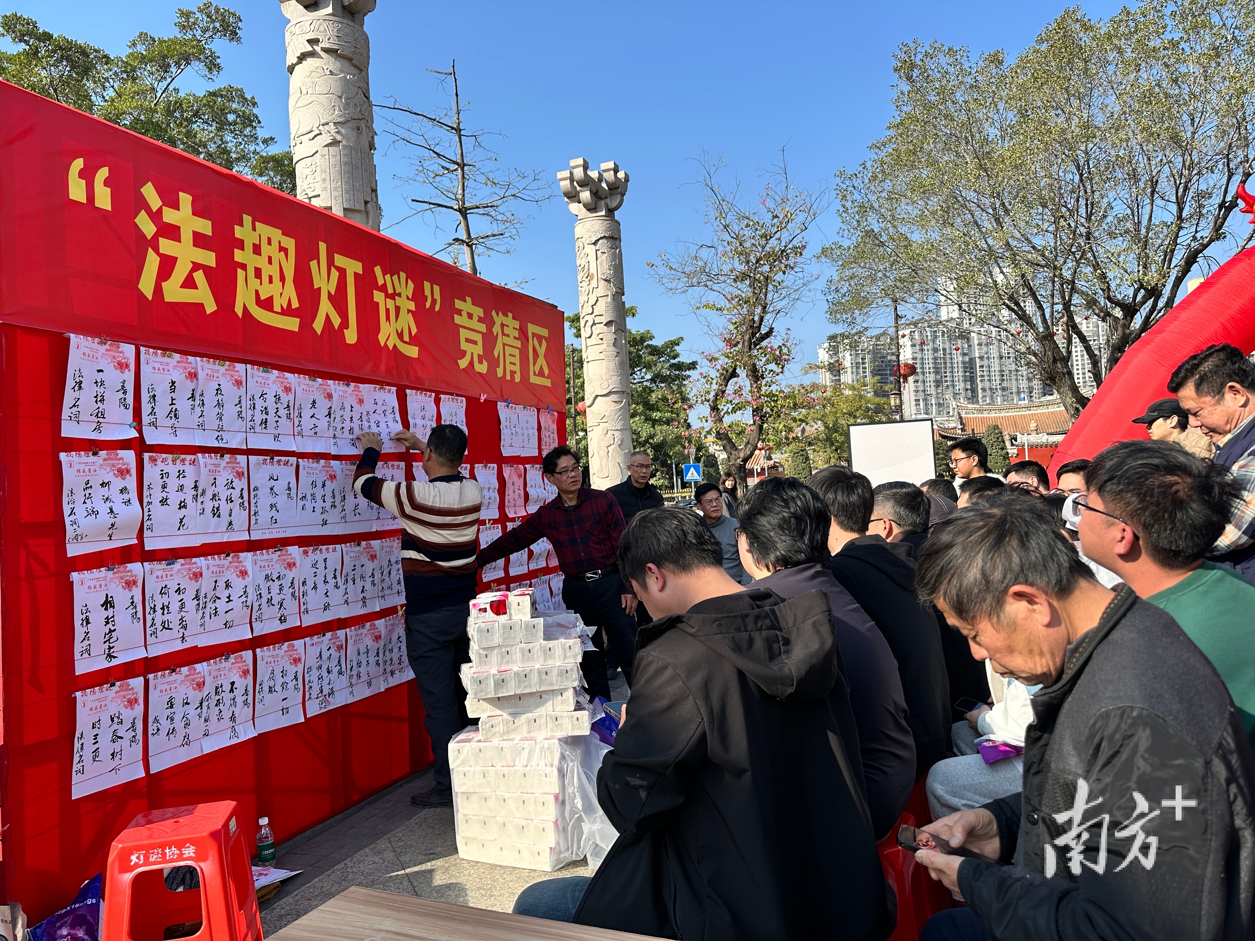 “法趣灯谜”竞猜区人气爆棚,宪法常识、民法典要点、反诈禁毒知识、未成年人保护条例等内容被巧妙融入灯谜中,群众踊跃参与、争相抢答,答对者收获的法治主题窗花、便携法律读本等小礼品,让普法知识在趣味互动中入脑入心。