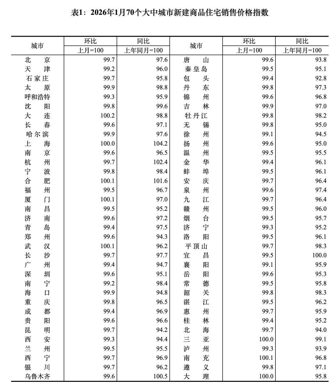 2026年1月份,70个大中城市商品住宅销售价格环比降幅总体收窄、同比下降。