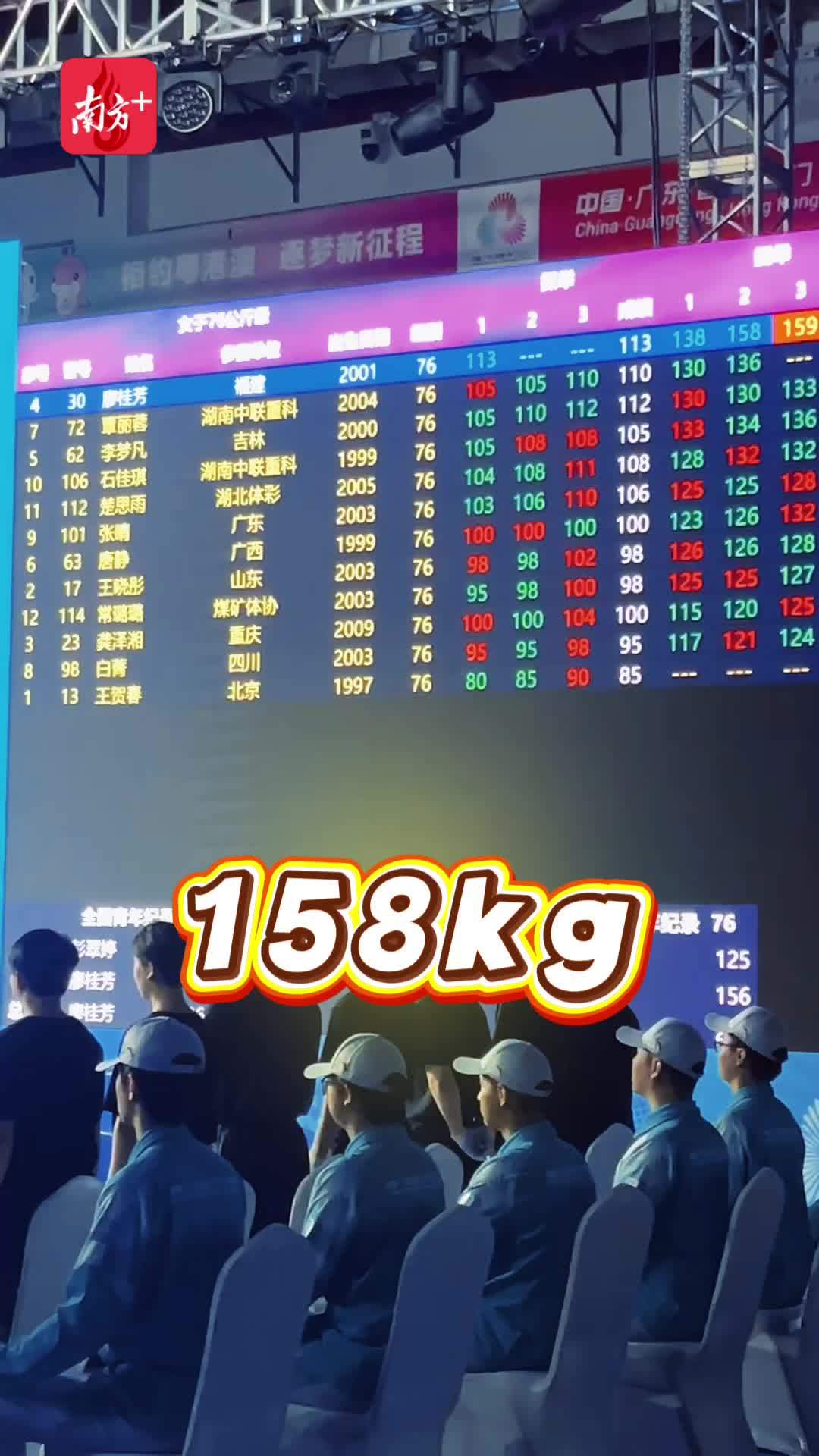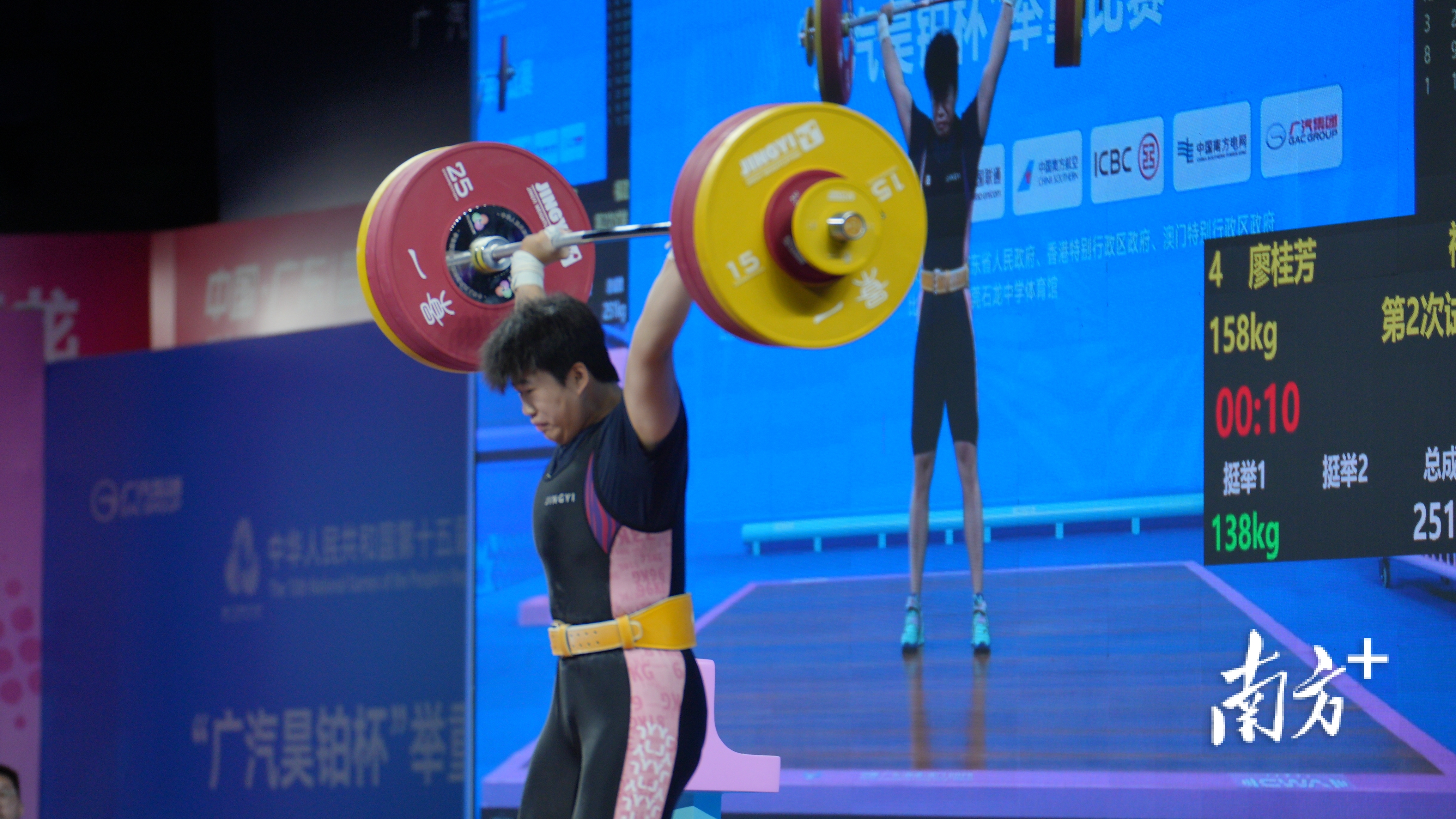 锁定冠军后,廖桂芳仍未放弃,直接将第二把试举重量调至158公斤,瞄准向艳梅创下的157公斤的全国成年挺举纪录发起挑战。廖桂芳稳稳举起158公斤后,随着三盏白灯亮起,现场宣布廖桂芳创全国成年挺举纪录,超亚洲成年挺举纪录、世界成年挺举纪录。