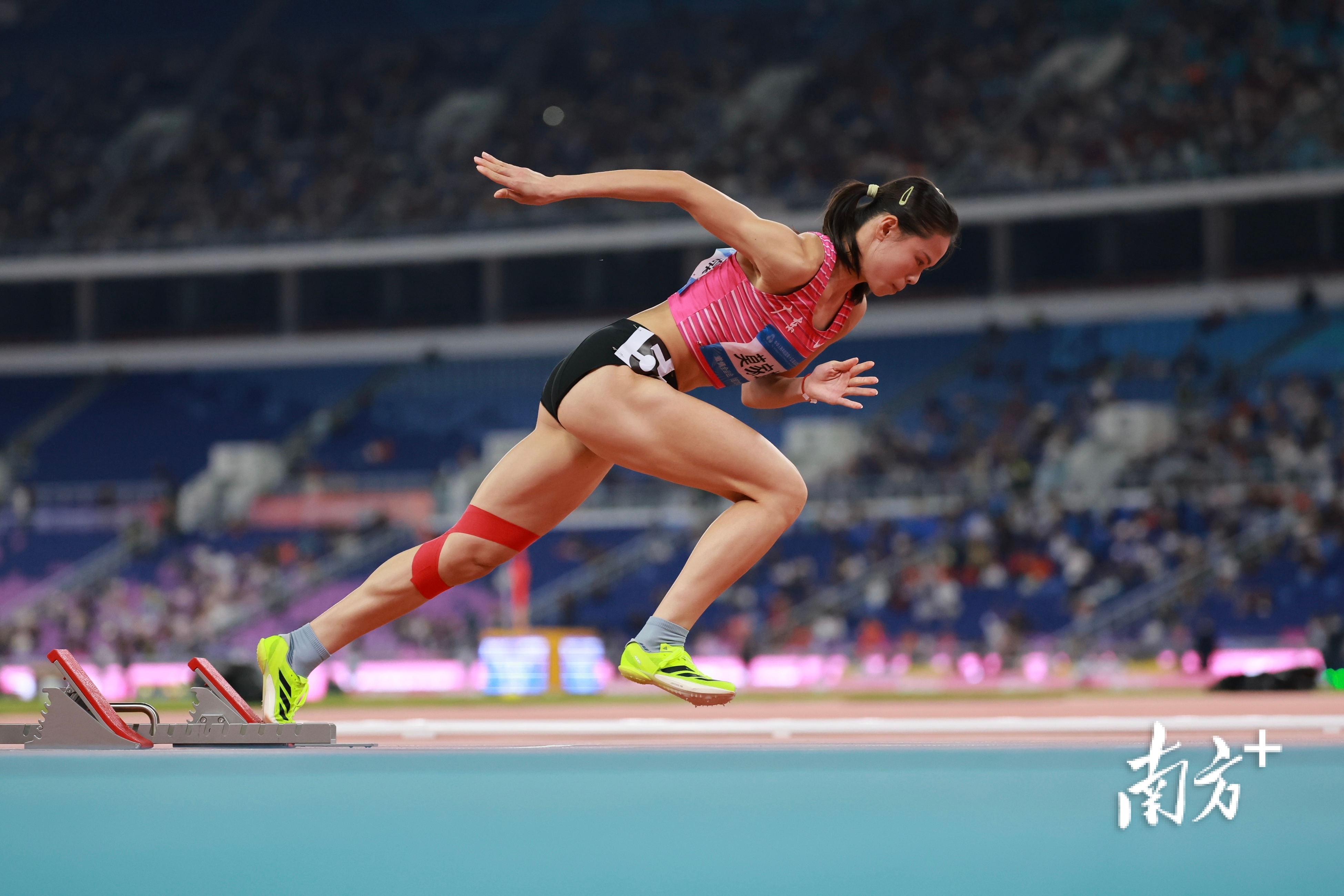 11月17日晚,十五运会女子400米栏决赛在广东奥体中心体育场举行。来自广东肇庆的选手莫家蝶在第五道出战,她的队友孔莹蓥第七道出战。