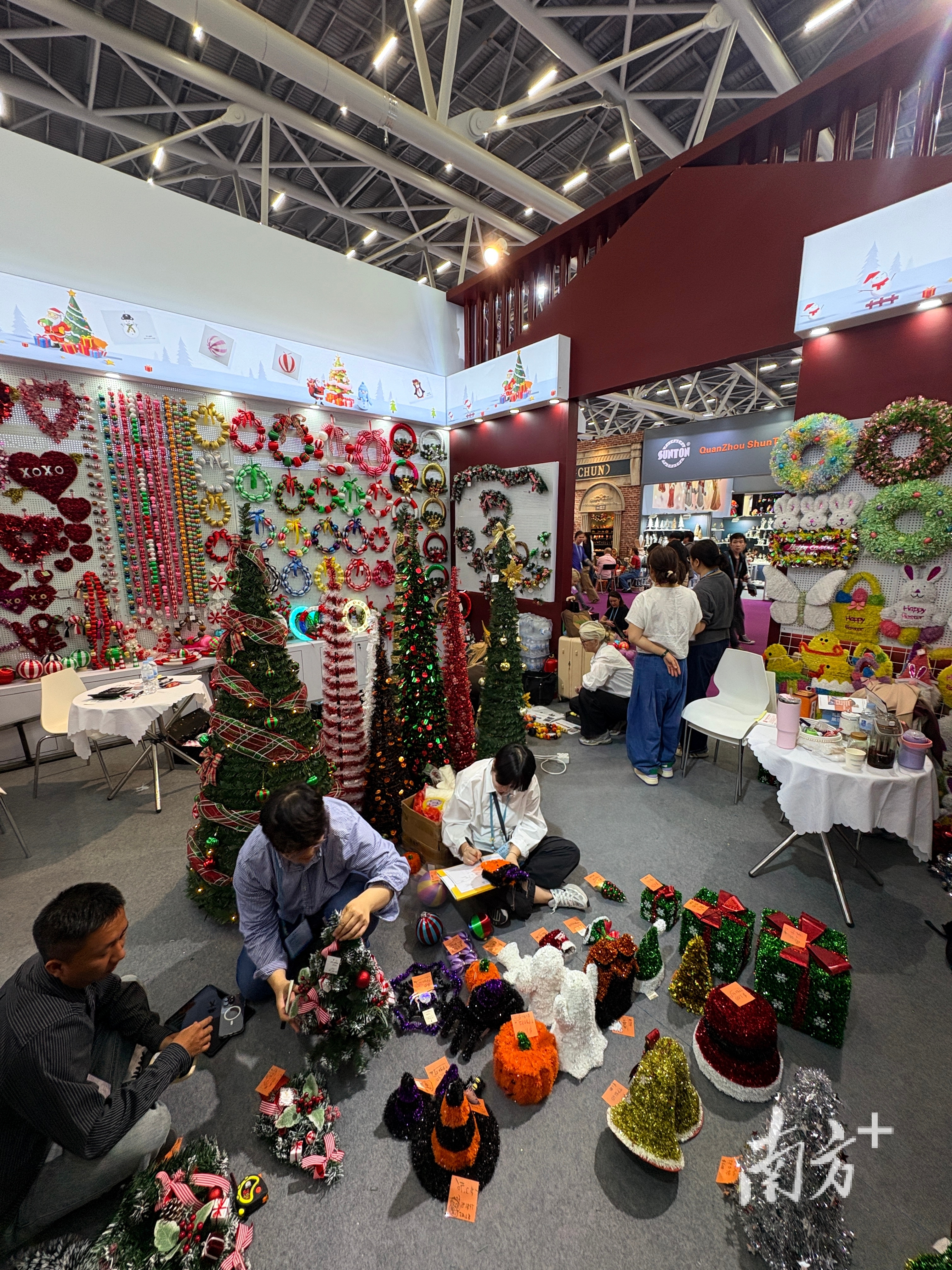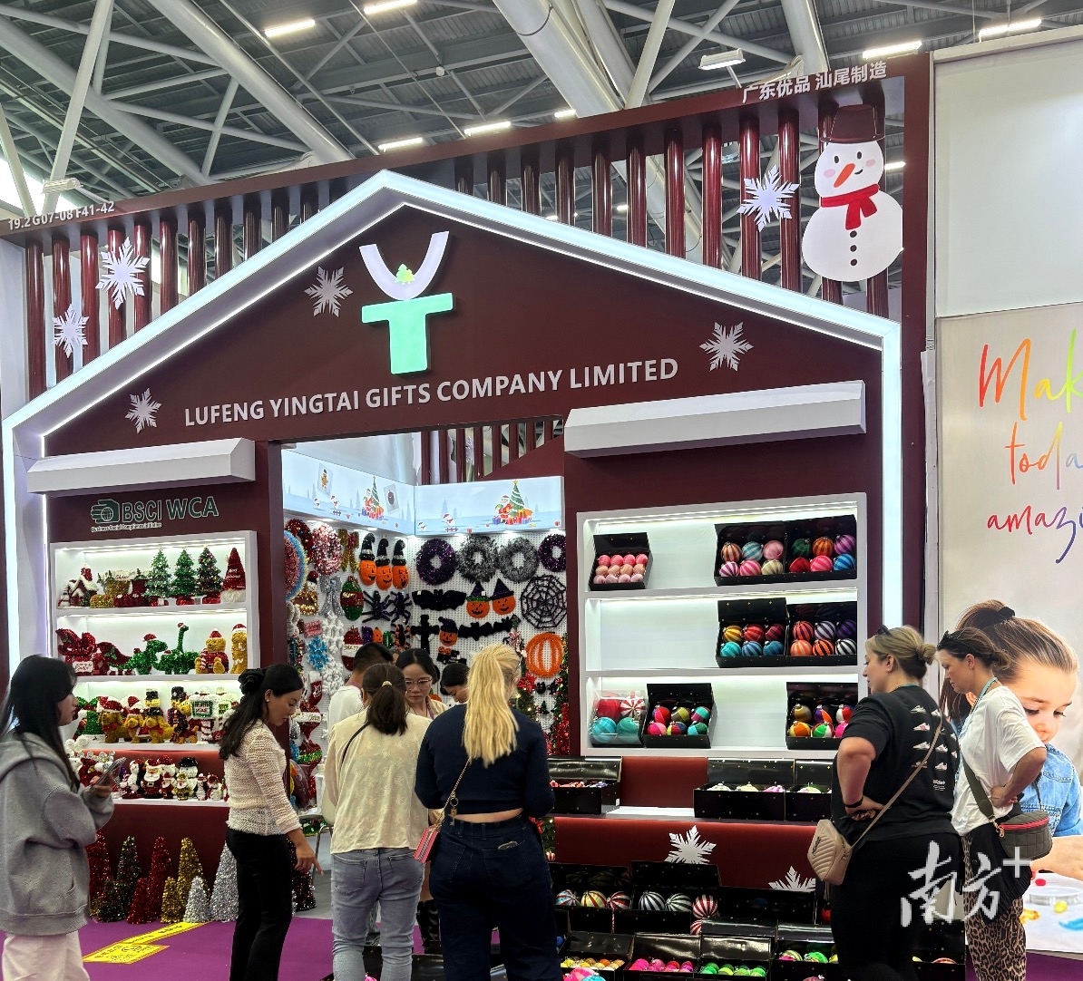 来自圣诞礼品产业专业镇陆丰市碣石镇的陆丰市盈泰礼品有限公司,带来了琳琅满目的圣诞节日氛围产品。“连续13年参展了,广交会是结识优质、稳定客户的最重要渠道。”该公司总经理翁展鹏说,目前该公司计划进一步扩大产能,以满足美国、澳大利亚、俄罗斯等外国客户的市场需求。
