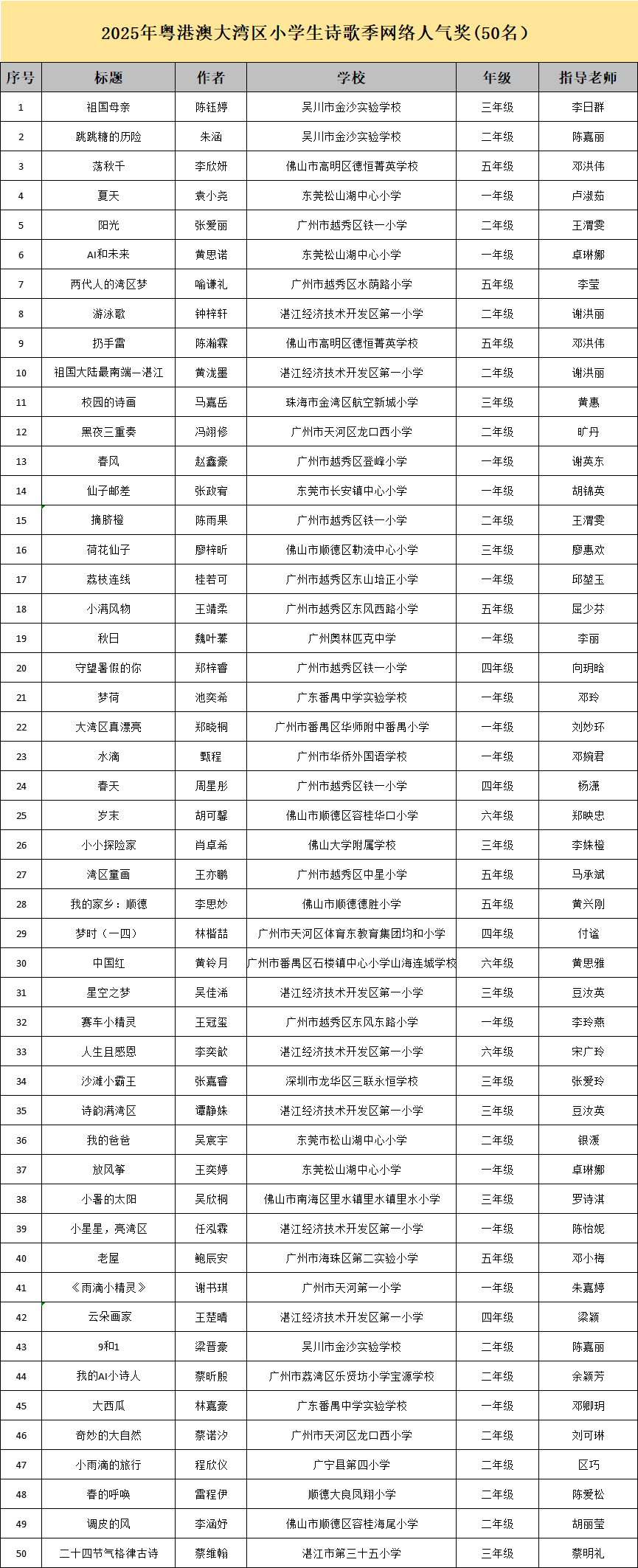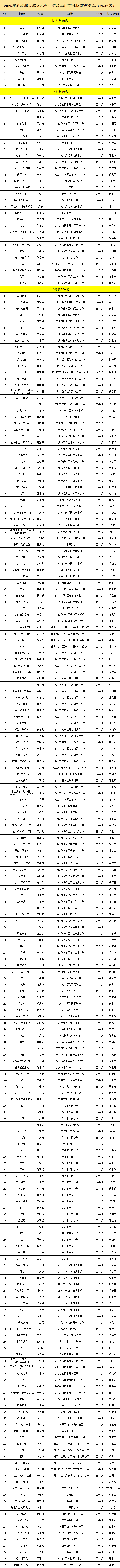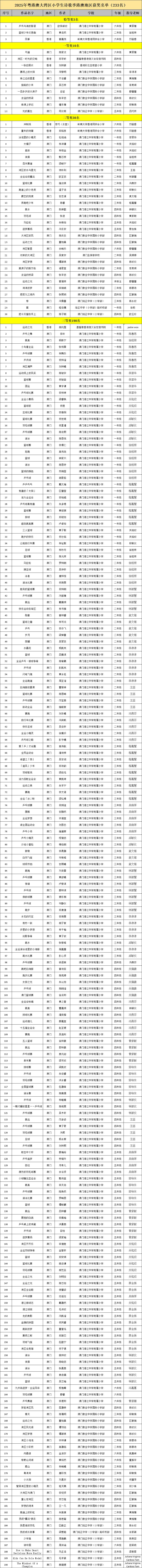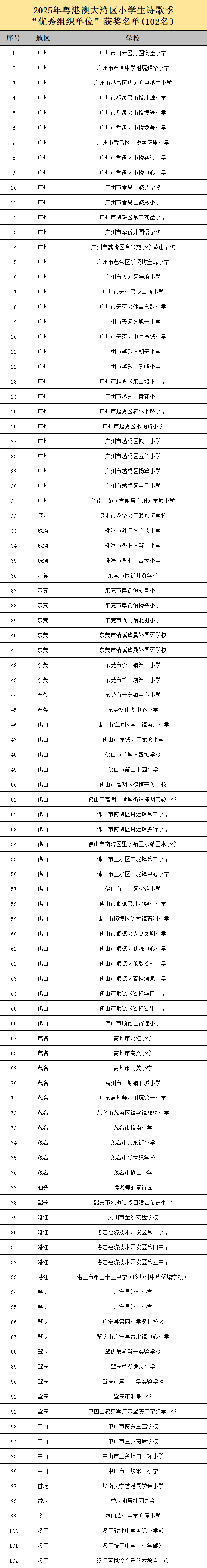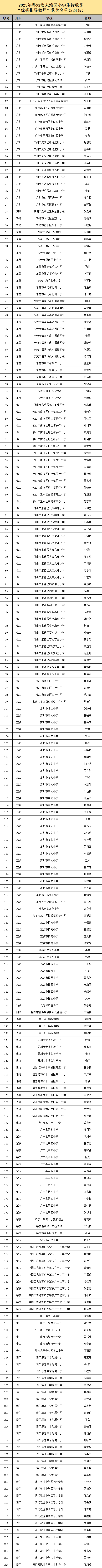 活动共评选出粤港澳三地102所学校、224名指导教师及近3000首获奖诗歌作品入围获奖名单,经过为期三天的公示期(2025年10月21日-10月24日),组委会根据有效反馈信息逐一核查与修订,现正式发布2025年粤港澳大湾区小学生诗歌季获奖名单。