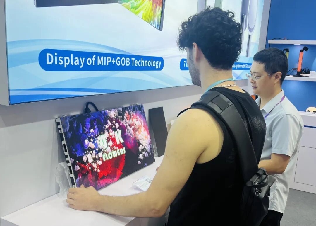 在LED显示领域,国星光电展位上一款应用国星光电MIP面板AS系列产品方案的超高清显示屏,凭借卓越的显示效果吸引了客商驻足参观和洽谈。该方案创新融合国星光电自主研发的MIP封装技术、模块化设计及覆胶防护工艺,具备在强光环境下展示丰富明暗层次和细节、防磕碰能力强、整屏节能好、使用寿命长等多项性能优势,能满足高端会议等场景的超高清显示应用需求。