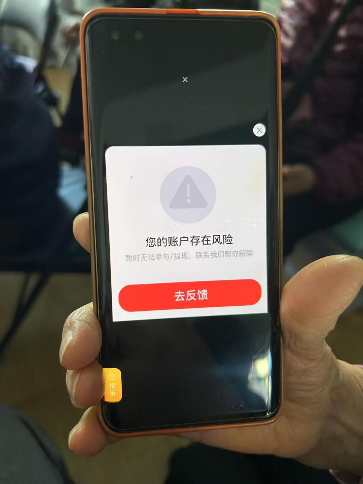 记者借用马女士的手机试了试,如果不慎点击到这个红包按钮,网页就会进行层层跳转,想拦都拦不住。最后,页面总是会出现一个安全提示,上边写着:“您的账户存在风险,暂时无法参与/提现,联系我们帮您解除”,下方则是一个“去反馈”按钮。由于担心点击之后会中木马病毒或是泄露信息,记者并未往下操作,马女士也表示,这个安全提示是第一次见,之前没遇到过。