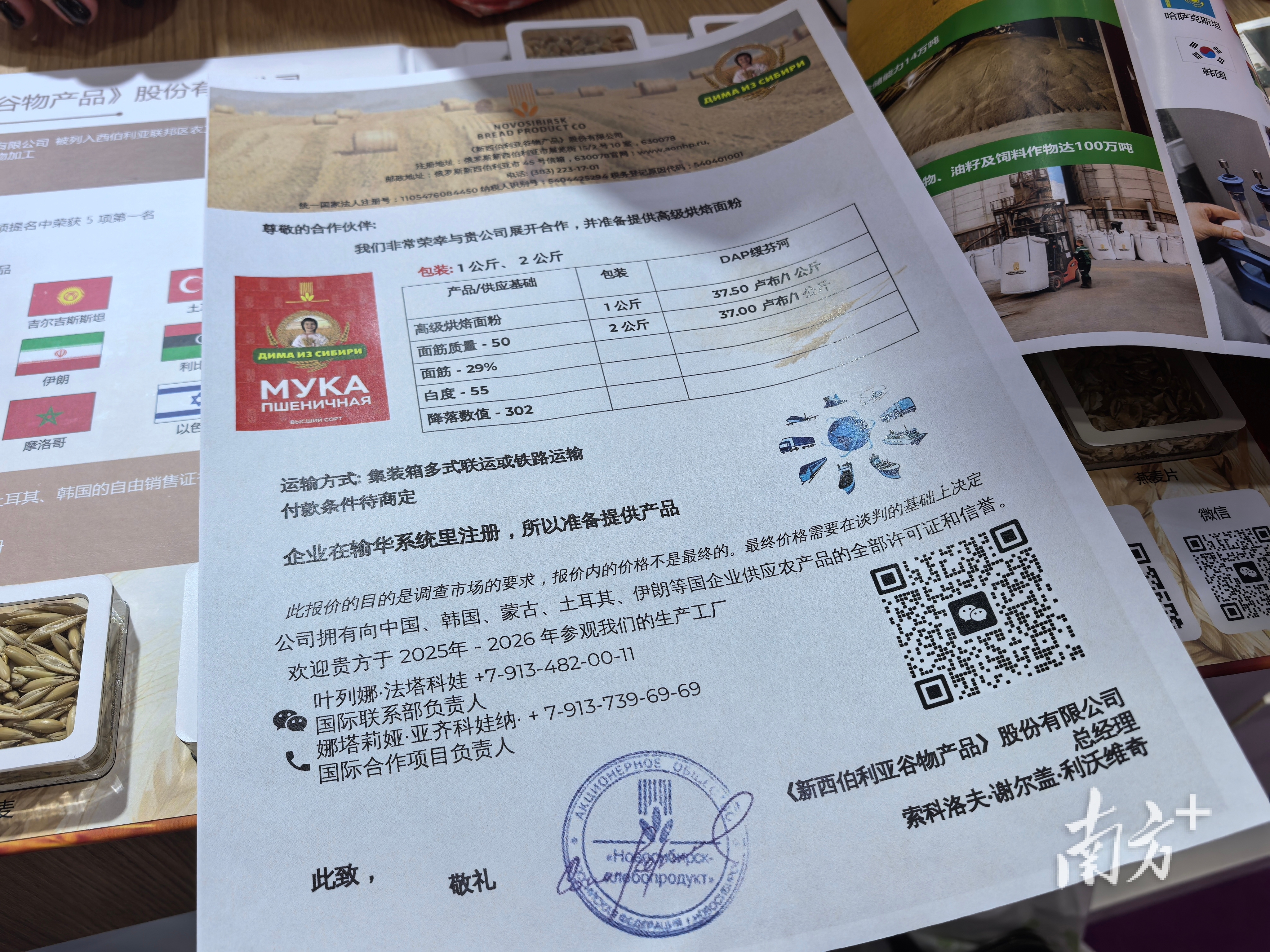 在进口展区,来自俄罗斯的新西伯利亚谷物产品股份有限公司第一次用上了中文宣传册,产品展示台不仅用中文标注了每款产品的名称,还在右下角“入乡随俗”地打上了负责人的微信二维码。