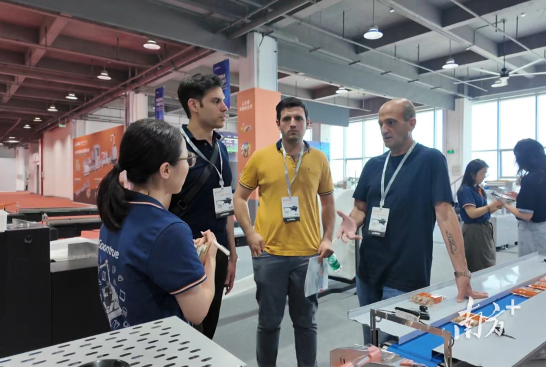 明亮的橙色展厅布局,一台台现代化、智能化的包装设备,阿根廷客人们全然抛去了生意桌上的拘谨,一边仔细研究机械设备,一边追问各种细节问题。