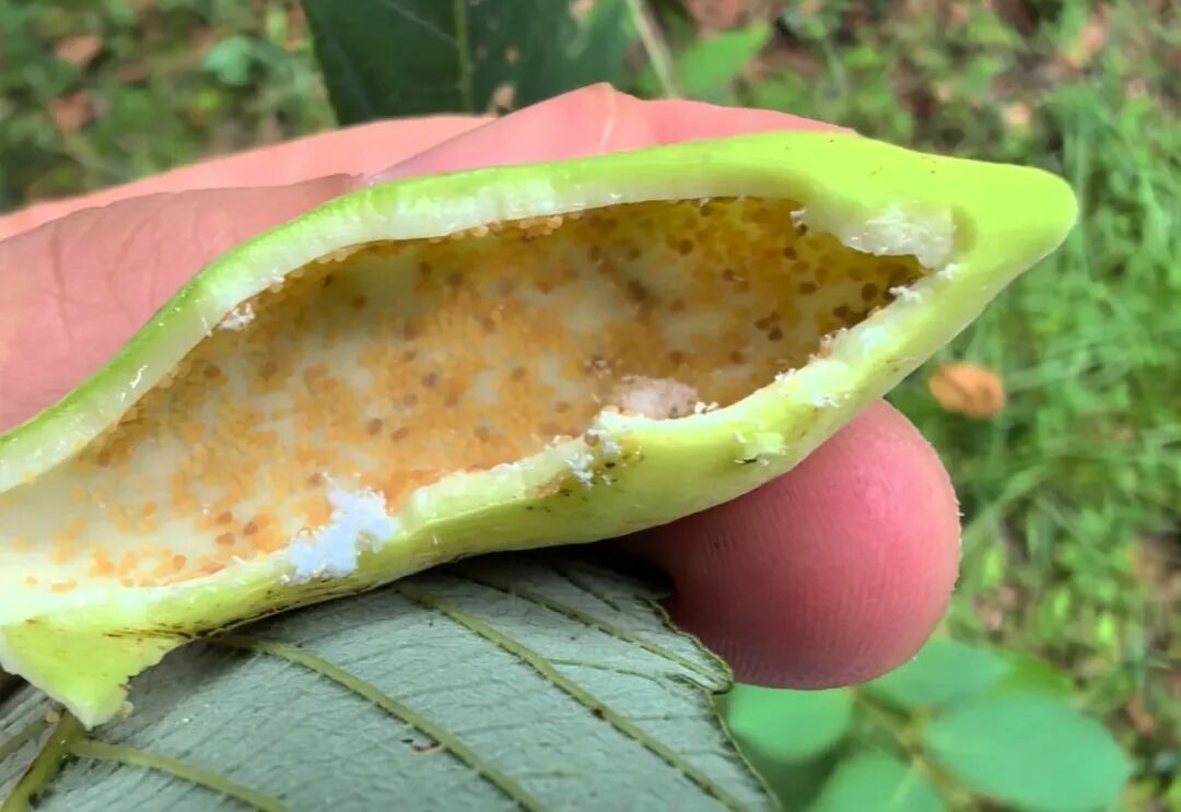 这时候,如果你好奇地将其摘下并剖开,那么你将获得一个难忘的画面,仔细看内壁上的小点还在不断爬动,没错,这个长得像果实的东西,其实是蚜虫在盐麸木上寄生的虫瘿(yǐng)。