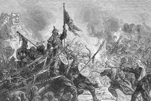▲英法侵略者描绘的北京八里桥之战,不屈的清军与旗手