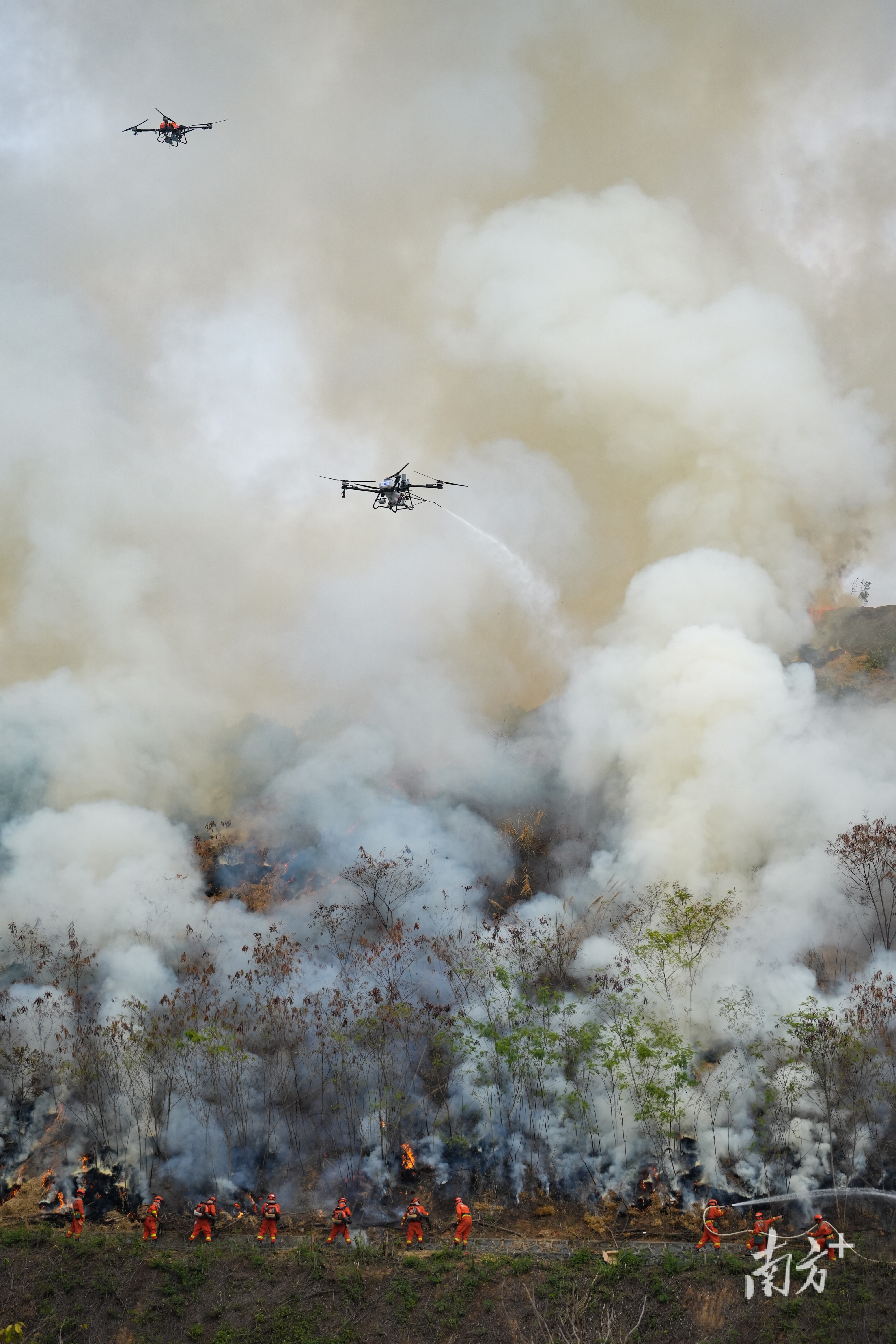 载弹和吊桶无人机压制火头。 通讯员 粤应宣 供图