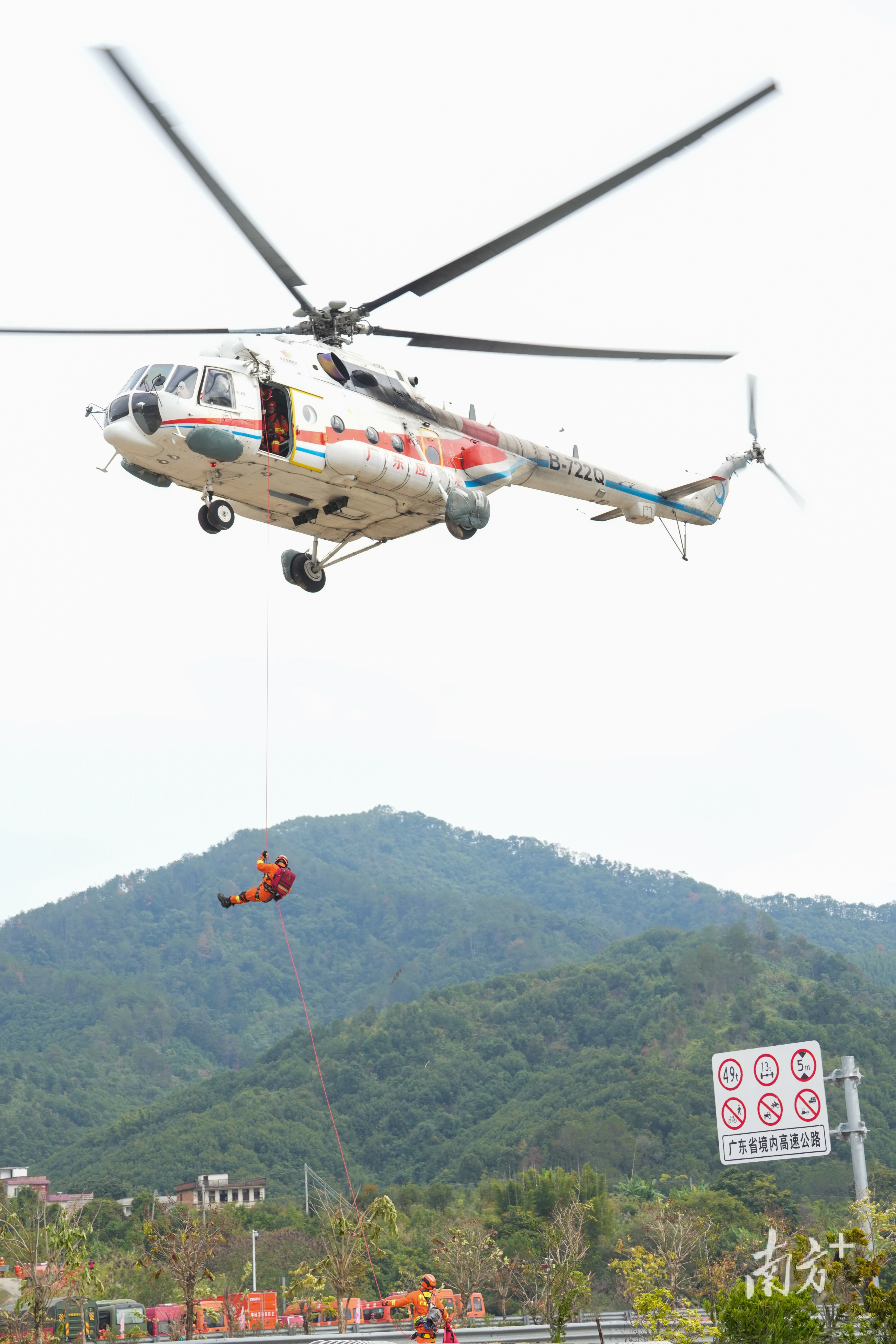 广佛肇高速公路肇庆封开段附近,多架无人机精准地将灭火弹投向模拟火点,Ka-32直升机吊载的巨大水桶将数吨水倾泻而下;在清远分会场,救援队员从高速公路服务区水池接力抽水;在梅州分会场,重型机械轰鸣着开辟隔离带……一场三地同步、五级联动的立体化灭火实战演练在广东三地展开。