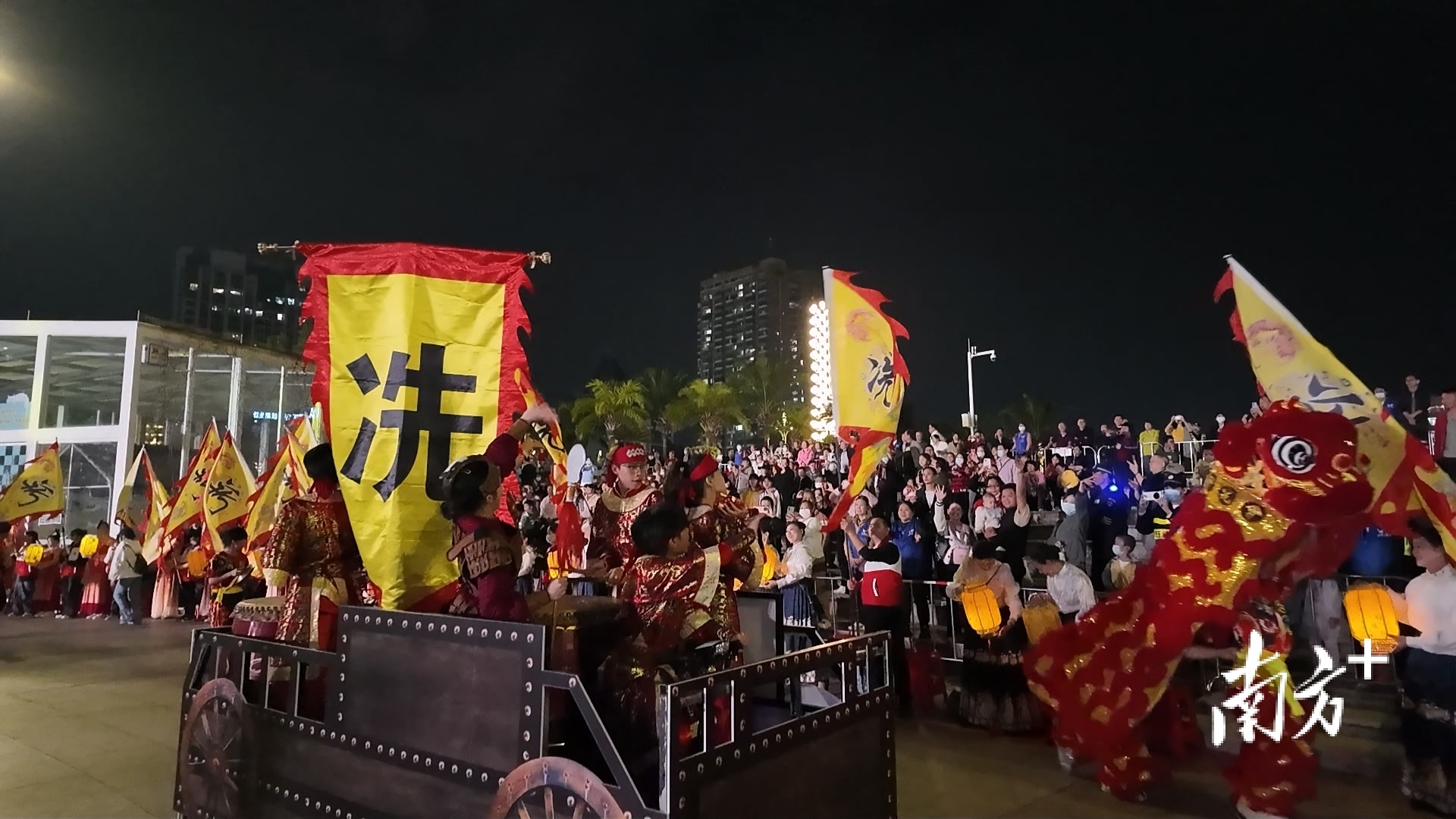 为打破传统舞台的空间限制,本次盛典特别设置了沉浸式巡游环节。在激昂的鼓乐中,由舞狮、冼太爱国战舞、灯笼舞等方阵组成的巡游队伍,以“检阅式”表演经过主舞台后,径直走入观众区,绕场互动。所到之处,欢呼声、掌声与律动融为一体,让非遗真正从“台上”走到了“群众身边”。