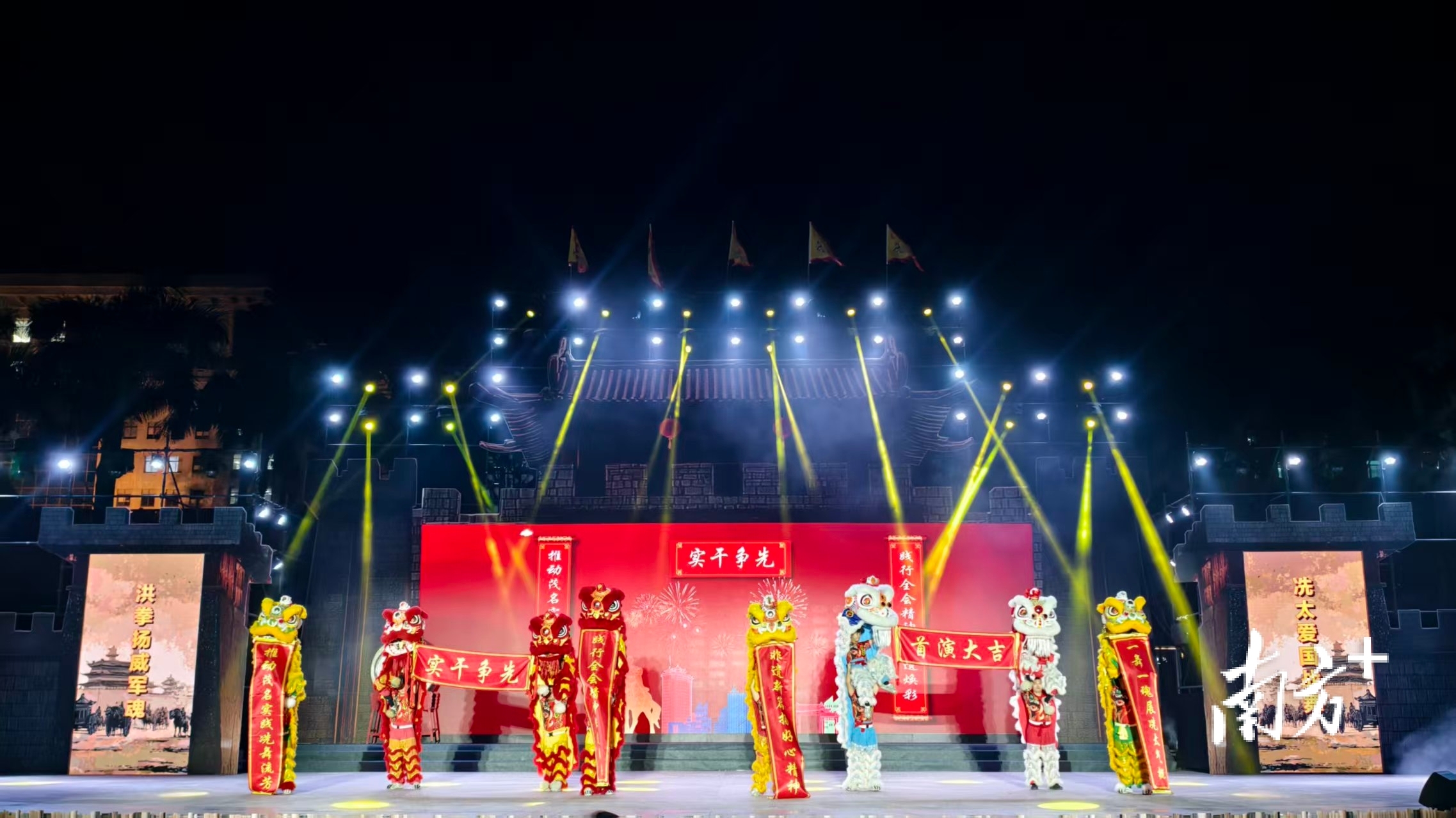活动在极具冲击力的“八狮献瑞”中开场。8头醒狮自观众席奔腾而出,于舞台中央以传统“吐字”技法亮出两幅巨联——“一舞一魂展冼太气概,非遗新篇扬好心精神”“践行全会精神,非遗焕彩;推动茂名实践,冼舞流芳”。精彩的表演,瞬间点燃了现场气氛。