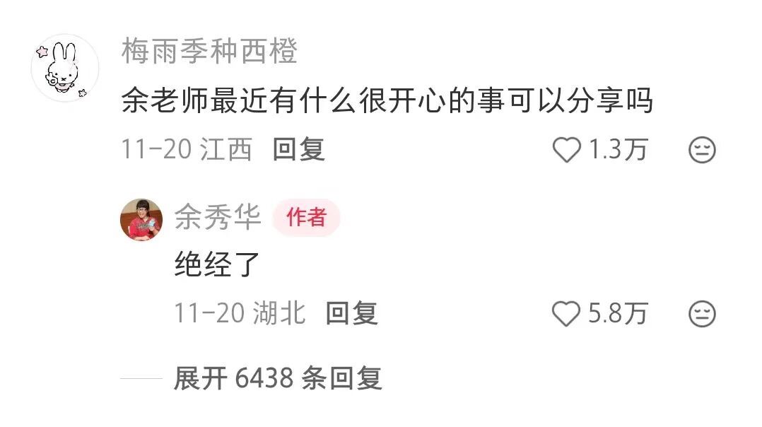 面对热衷聊闲篇的网友,余秀华老师也以“一句封喉”式的幽默奉陪。面对“老师我想和你畅聊一个晚自习”,她坦言“没那么多话”;面对“总想玩手机”的“废话文学”,她表示“是手机总想玩你”;问“最近有什么很开心的事吗”,她表示“绝经了”。