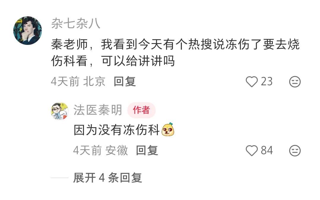 另一位“活人感”作家则是法医、作家@法医秦明。在小红书上“活了”超过4年的法医秦明因为一条AMA笔记又“活”了一次。有网友惊叹,原来法医秦明不只是电视剧里的形象,而是真人。更有人试探着问:“我看到今天有个热搜说冻伤了要去烧伤科看,可以给讲讲吗”。法医秦明回复:“因为没有冻伤科”。这幽默的体质,看来是真秦明无误。