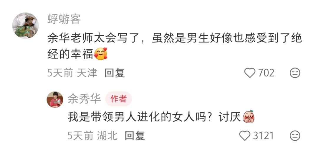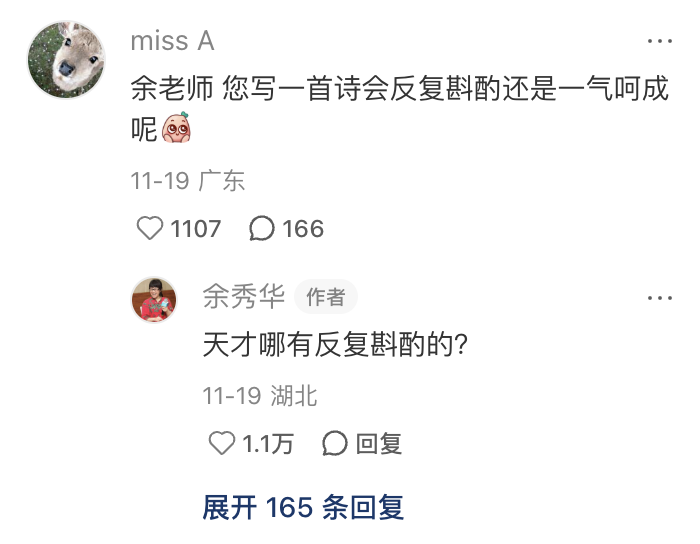 当然,面对偶尔走错片场串台的网友,余秀华老师则展露出了傲娇又不好意思的一面。