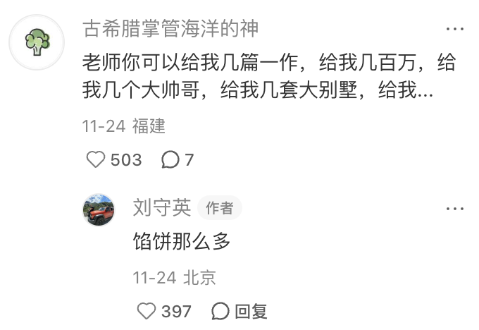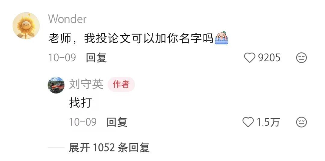 在他“终于有钱在食堂吃红烧肉了”的帖子下,有网友大胆开麦:红烧肉我请您吃,老师文章挂我一作。而刘守英的回答也很简洁:不行。