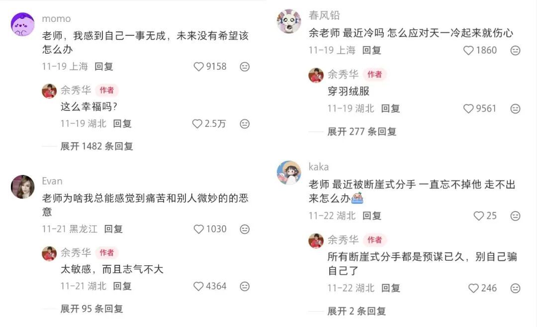 除了文学创作,日常分享和生活疑问也可以尽情砸来,不怕你不问,就怕你接不住余秀华的回答。