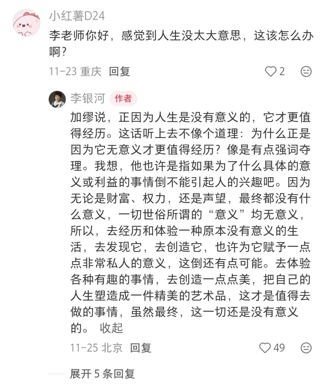 对此,中国社会科学院社会学研究所研究员、知名学者@李银河在AMA的笔记评论区表示:“一切世俗所谓的‘意义’均无意义,所以,去经历和体验一种原本没有意义的生活,去发现它,去创造它,也许为它赋予一点点非常私人的意义。”