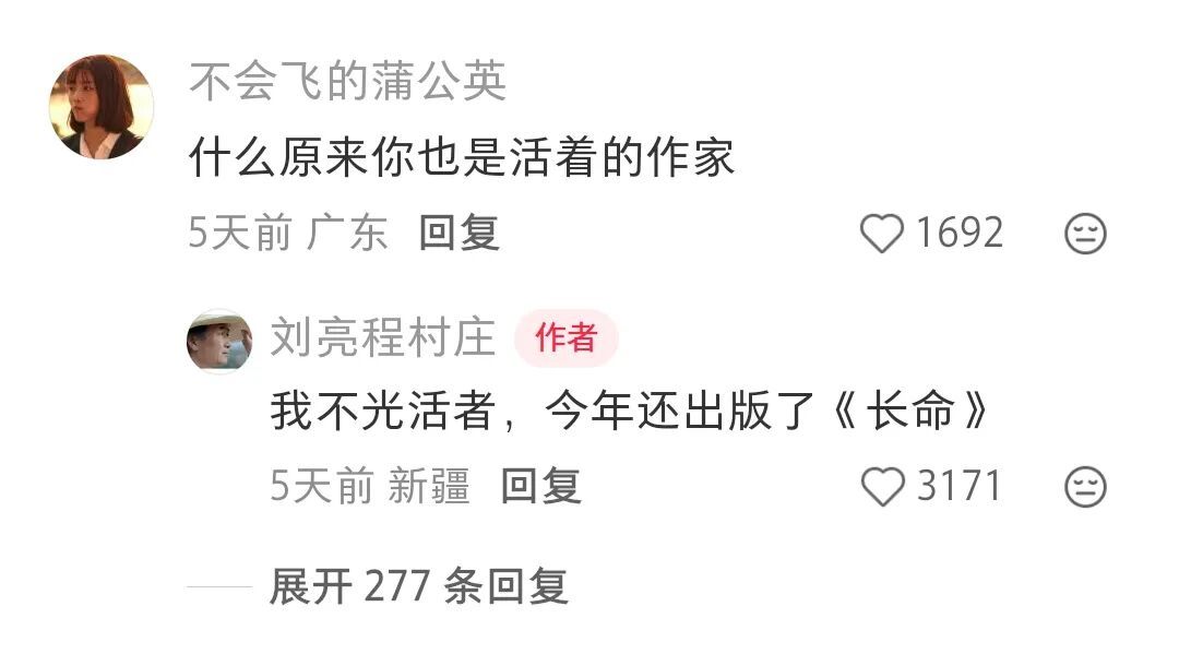 说到“活人感”,以《一个人的村庄》闻名的作家@刘亮程村庄 也在小红书上凑热闹发布了一条AMA笔记。有网友惊叹,这位凭借着超过50篇作品收入语文教材及试卷的作家,居然还在世:“原来你也是活着的作家”,刘亮程从容回复“我不光活着,今年还出版了《长命》。”一句话,又被他炫到了。