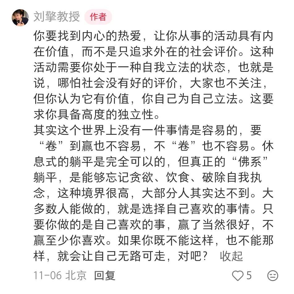 面对网友们关于卷又卷不赢,躺又躺不平的生存焦虑,刘擎则表示,焦虑可以分为两种,一种是存在论意义上的焦虑,这是每个人都会遇到的困境,一种是生存焦虑,是生计焦虑,比如现在的工作或者事业发展。而应对焦虑的办法或许是,找到内心的热爱: