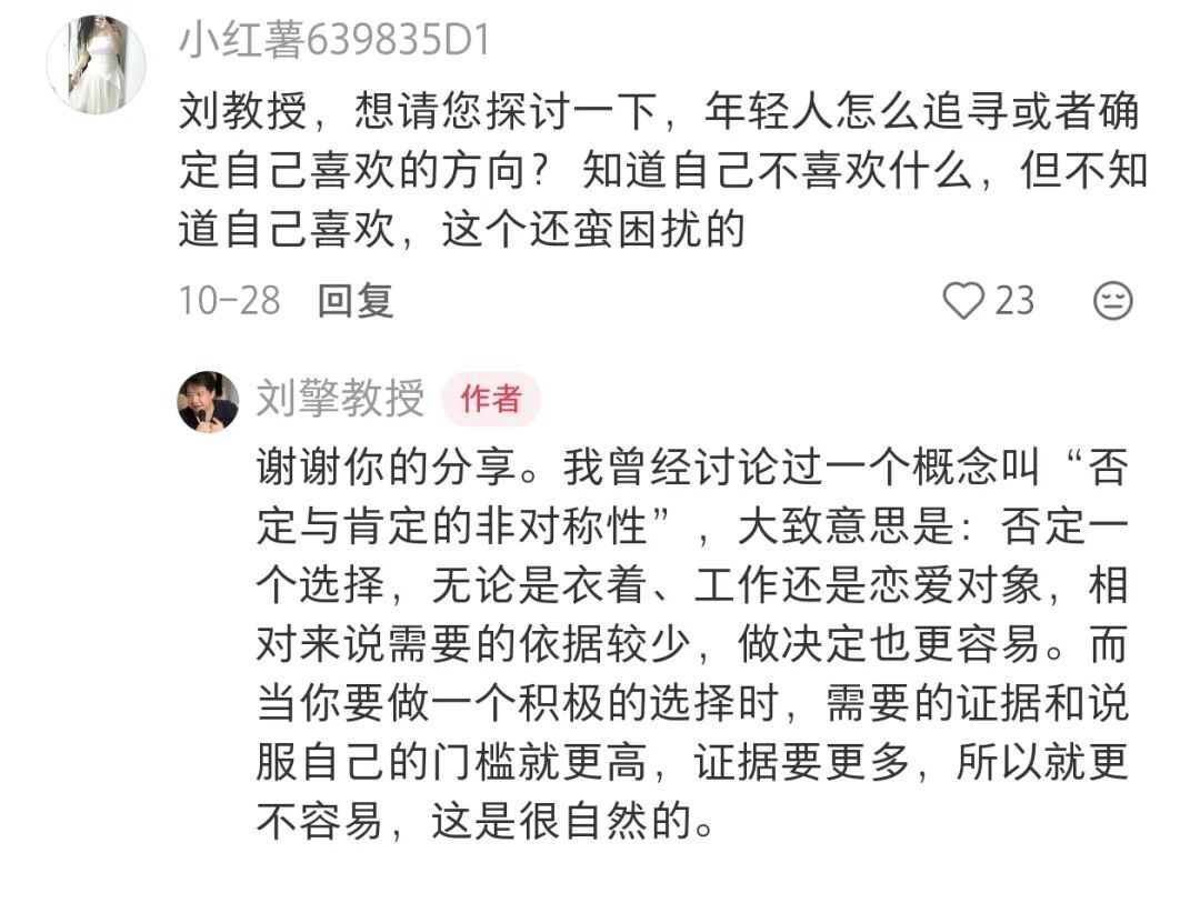 而华东师范大学的@刘擎教授,则是将哲学理念融入具体解答的行动派,评论区里,他认真又专业的回答,仿佛一场微型讲座。