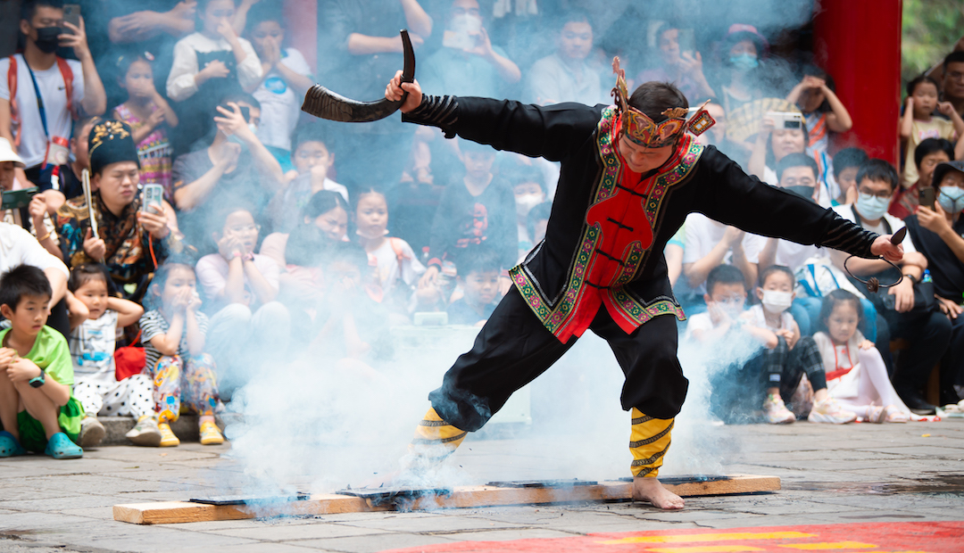 活动期间,众多非遗传承人、绝技达人齐聚,上演“百艺绝活大观”。哈尼族吞火吐火杂耍惊险刺激,佤族吊葫芦展现高超技艺,傣族多玛龄、侗族仙人合竹各具民族特色。苗族第一变脸特技大师李永春将在苗寨、侗寨表演踩钢刀吹芦笙、赤脚上刀梯,更在锦绣楼前挑战刀架脖子拉电车的极限技艺,每日一场。每晚翠湖的非遗火壶钢花,如璀璨星河,尽显非遗浪漫。