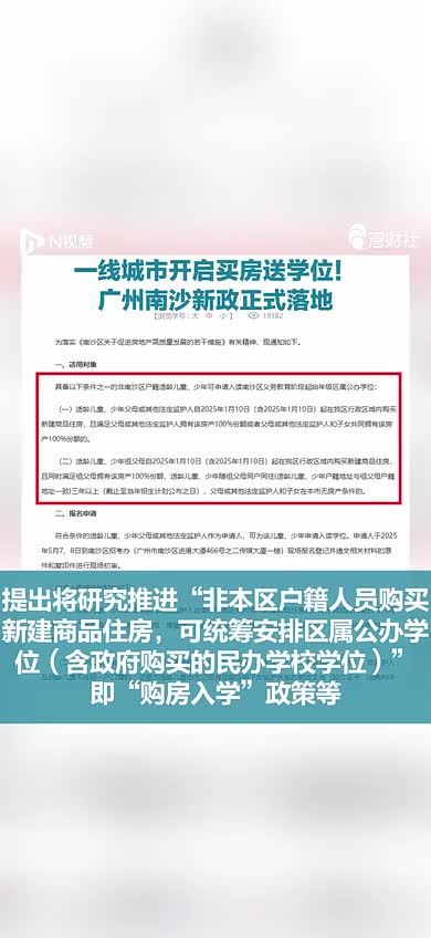 近日,广州市南沙区教育局发布通知,宣布2025年1月10日(含2025年1月10日)起在南沙购买新建商品住房的家庭可为家中适龄孩子申请入读公办学位。申请条件>>