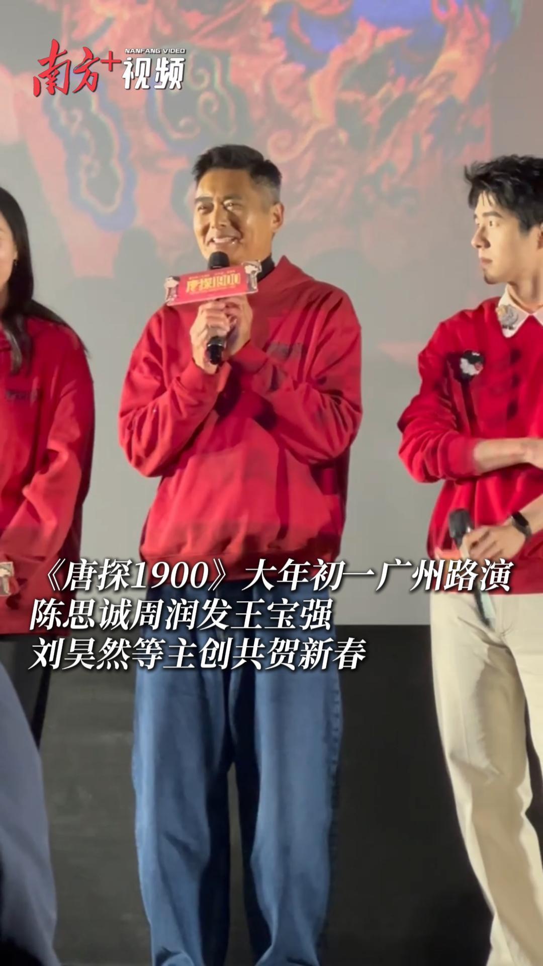 1月29日,正逢大年初一,春节档新片《唐探1900》剧组便马不停蹄来到广州路演,导演陈思诚、戴墨,演员王宝强、刘昊然、周润发、尹正,总制片人范霞亲临现场,与广州观众共贺新春,欢乐交流。“发哥”周润发的出现令现场观众热烈欢呼,周润发陈思诚王宝强现场比心“发糖”,尹正则教刘昊然用粤语讲“恭喜发财”,向观众拜年。