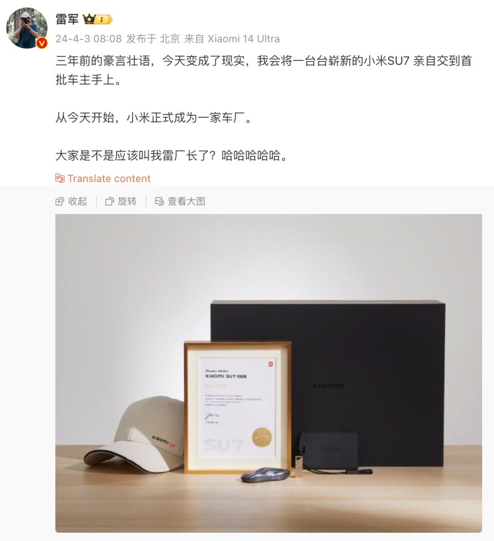 4月3日早间,小米集团董事长雷军在微博发文称,“三年前的豪言壮语,今天变成了现实,我会将一台台崭新的小米SU7亲自交到首批车主手上。从今天开始,小米正式成为一家车厂。大家是不是应该叫我雷厂长了?哈哈哈哈哈。” 编辑 毛帅楠 订阅后可查看全文(剩余80%)
