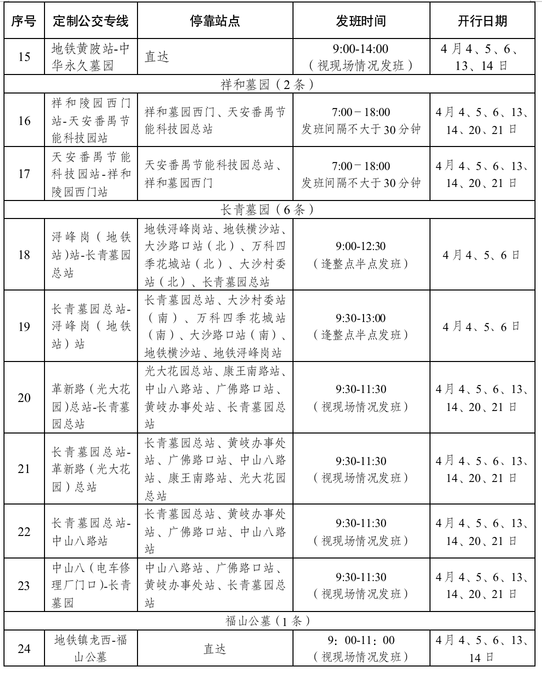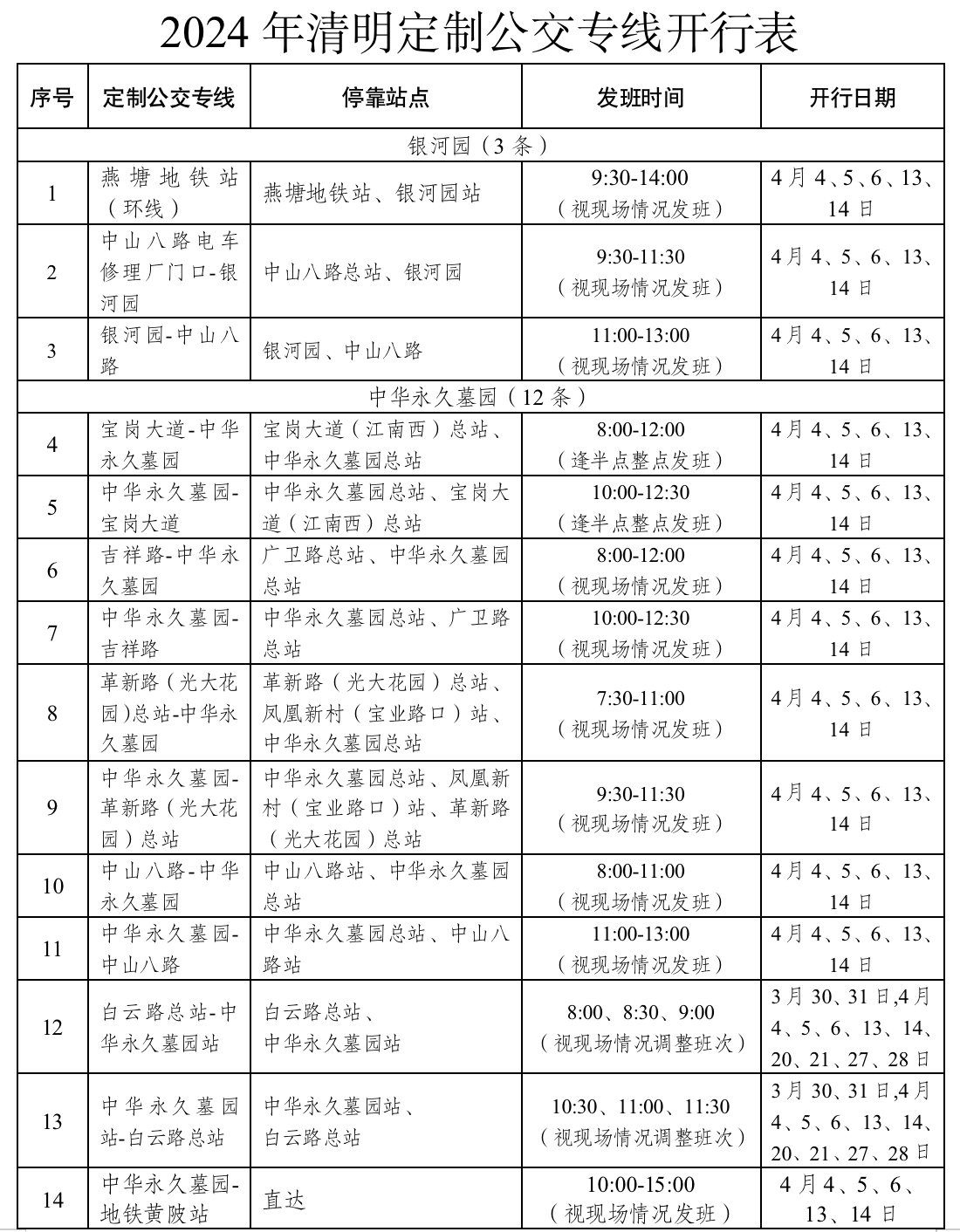 清明将至,广州市交通运输部门组织各公交企业,开设24条往返市内各主要墓园的定制公交专线,在清明假期及随后两个周末(4月4、5、6、13、14、20、21日)开行。