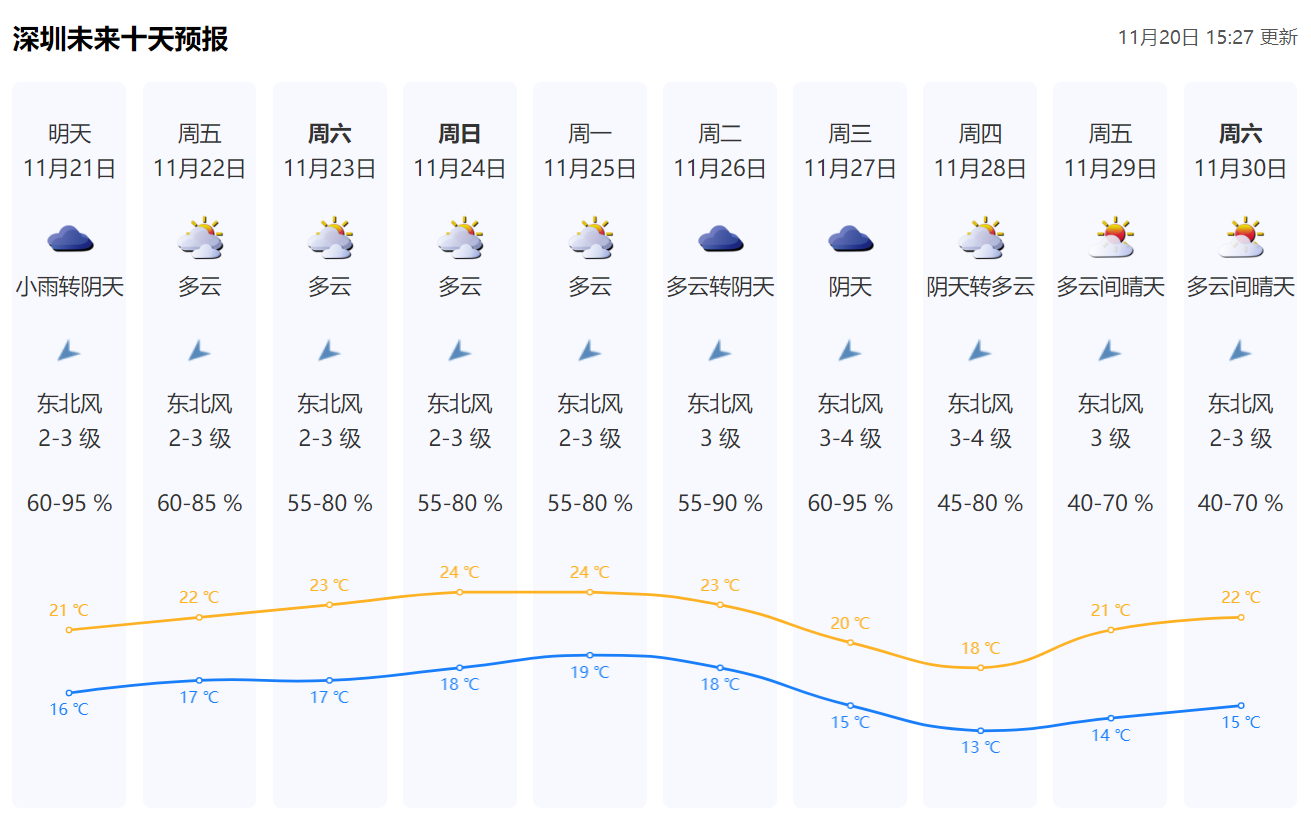 深圳市气象台预测,预计21日小雨转阴天,下午天色渐转明朗,气温16-21℃;22-25日多云为主,气温缓慢回升,早晚清凉;26日起新一轮冷空气影响,气温下降。