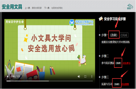 学生可以通过平台自主学习安全知识、参与安全专题活动等。平台课程主要分为常规课程和专题活动两大部分:常规课程由教师授课,幼儿园至初中阶段,每学期6-8课时,平均每2周1课时;高中阶段每学期4课时,平均每月1课时。课后一般会布置一个课后巩固练习,主要是一个短视频和几道测试题,完成时间约3至5分钟,供学生选做。