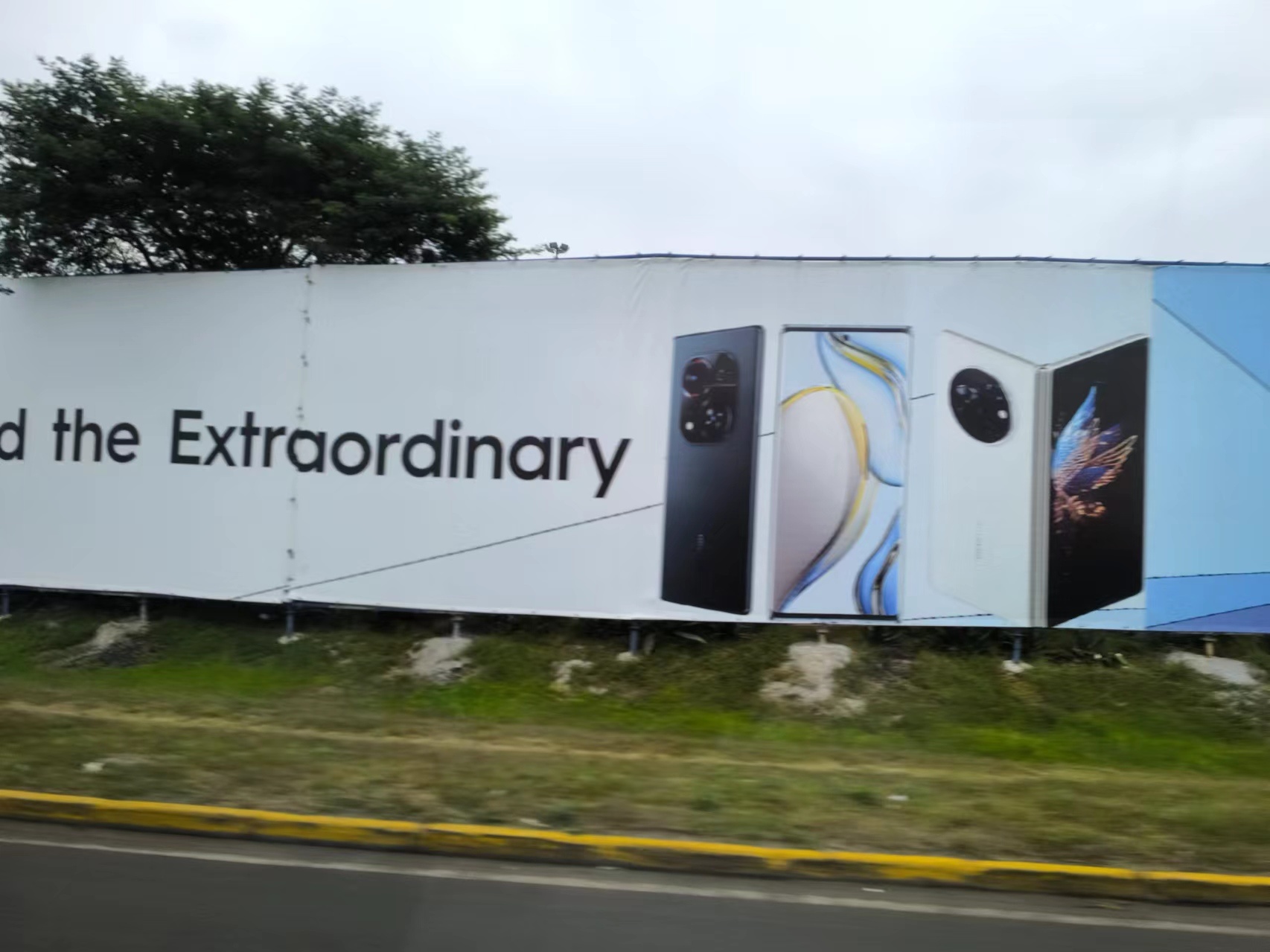 而就在高速口,迎面而来的是一副巨大的传音手机广告,完整占据了一堵20多米长的墙面。