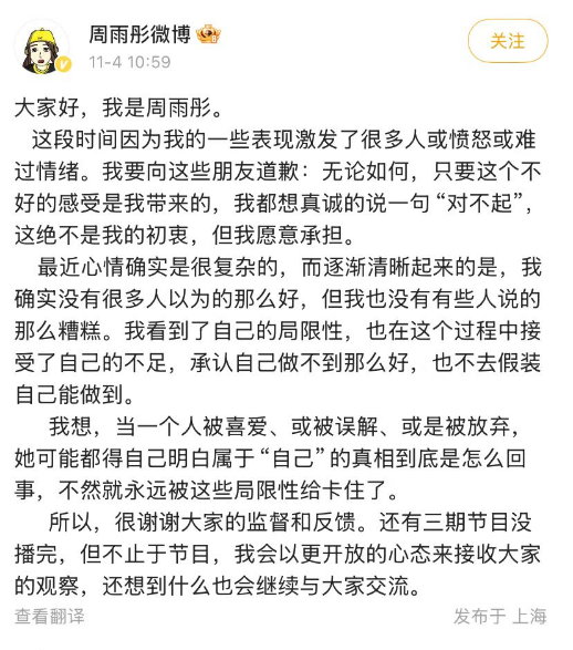 11月4日,周雨彤发博回应最近争议,话题#周雨彤发文#冲上热搜第一。全文如下: