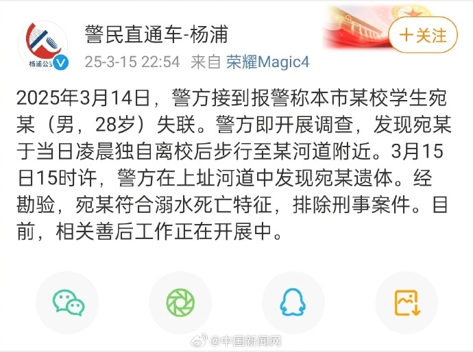 @警民直通车-杨浦 15日晚通报:3月14日,警方接到报警称上海市某校学生宛某(男,28岁)失联。警方即开展调查,发现宛某于当日凌晨独自离校后步行至某河道附近。3月15日15时许,警方在上址河道中发现宛某遗体。经勘验,宛某符合溺水死亡特征,排除刑事案件。目前,相关善后工作正在开展中。