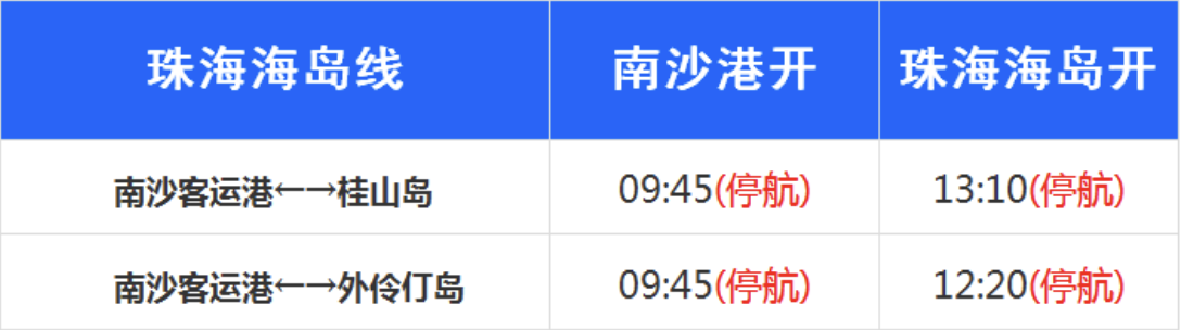 8月29日,南沙客运港发布消息, 受台风“苏拉”影响,南沙至珠海海岛线航班8月31日至9月5日暂停营运,具体航班时间如下: