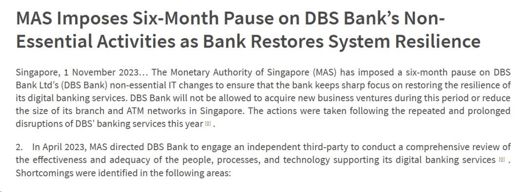 11月1日,新加坡金融监管局(The Monetary Authority of Singapore,MAS)公告,已对星展银行有限公司(DBS Bank Ltd)的非必要信息技术(IT)系统变更实施为期6个月的暂缓。在此期间,星展银行不得收购新的企业,也不得缩小其在新加坡各分行和自动取款机(ATM)网络的规模。星展银行则回应称,该措施主要暂停非必要的技术更新和新机构的收购业务,目前所有现有业务和客户并没有受影响。