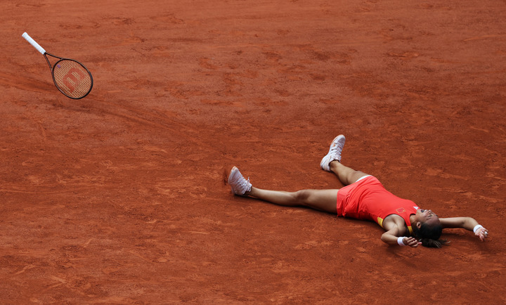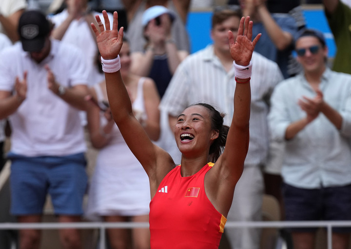 在罗兰-加洛斯网球场的中央球场,中国选手郑钦文2:0战胜维基奇,拿下奥运金牌,缔造中国网球奥运单打项目历史。