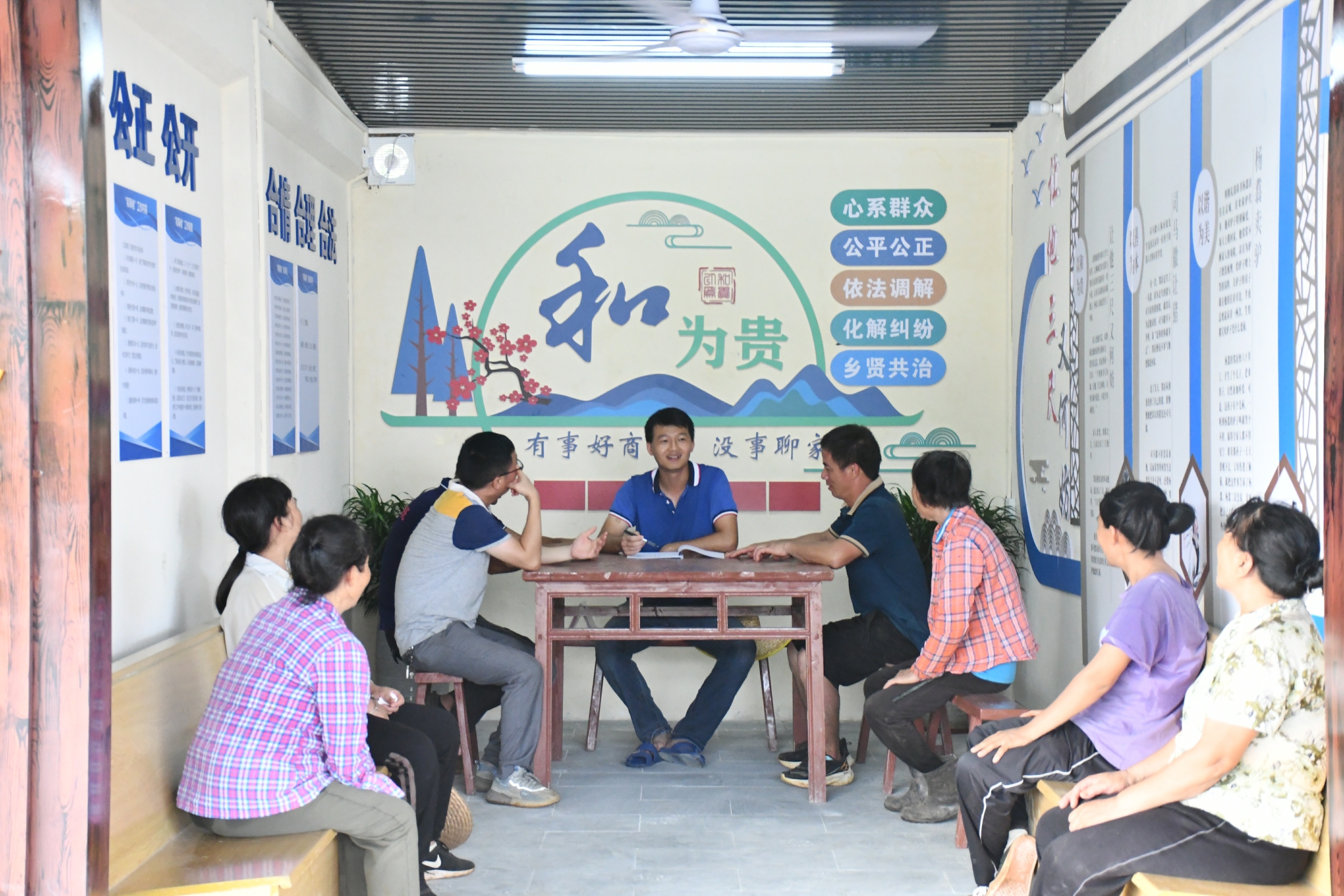 “和事堂”整个环境布置合理、舒适清新,门口两侧树有“邻里之间常沟通,帮难解困播春风”的楹联,堂内正中央写着“和为贵”三个大字,墙壁上布置有“心系群众、公平公正、依法调解、化解纠纷、乡贤共治”等标识,同时张贴有“和事佬”工作机制、组成人员和具体职责等内容。