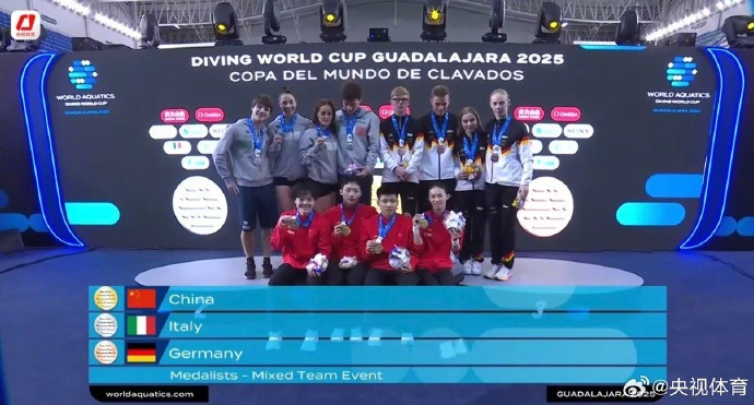 北京时间4月5日上午,在跳水世界杯墨西哥瓜达拉哈拉站混合团体决赛中,由陈艺文、王宗源、陈芋汐、程子龙组成的中国队展现强劲实力,以四轮总分489.10的成绩遥遥领先并夺得金牌。意大利队416.45分获得银牌,德国队396.20分获得铜牌。这枚混合团体金牌是中国跳水梦之队在本站比赛中夺得的首金。