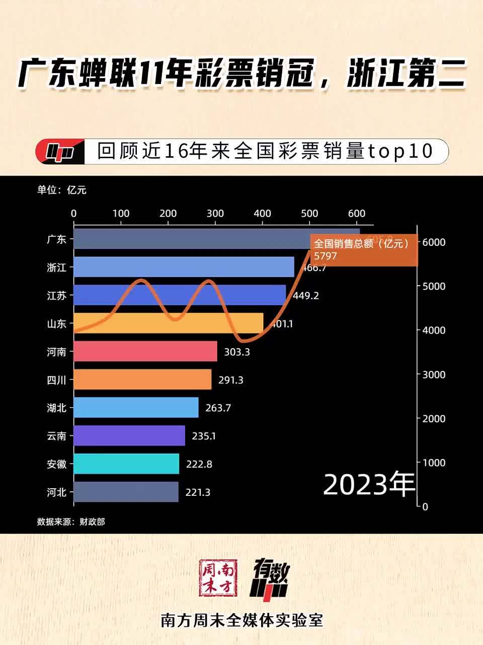 2023年,全国共销售彩票约5796.96亿元,创历史新高。回顾近16年来彩票销售额,广东已连续11年排名全国第一。浙江自2020年起跃居第二,人均购彩金额比广东还高。排名第九的安徽是前十中彩票销售额增长最快的省份,过去一年增长近五成。详情>>