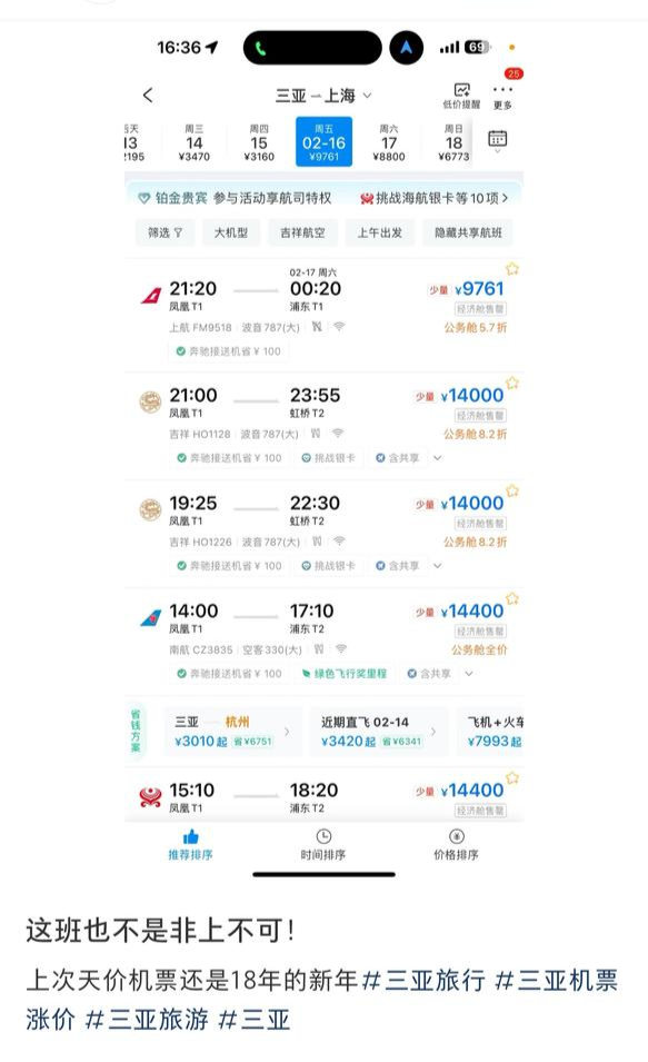 2月13日上午,记者搜索到,目前三亚回程机票价格确实在暴涨。以三亚飞上海为例,2月14日-15日,只剩少量的全价经济舱机票,价格在3500元左右。公务舱的价格从8000元至17000元不等。2月16日-17日,经济舱的机票几乎全部售罄,公务舱的价格均在14000元以上。
