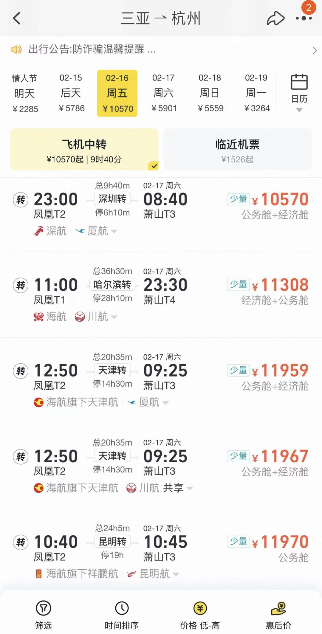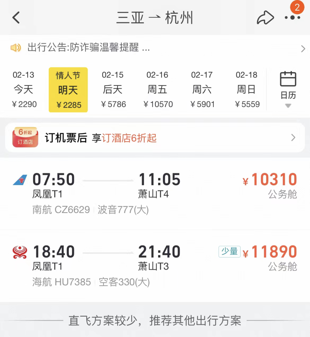 记者搜索了三亚飞杭州,明后天航班经济舱的机票非常紧俏,公务舱的价格则破万。